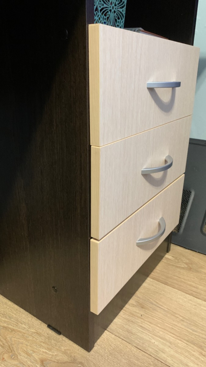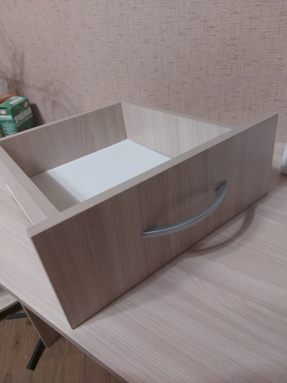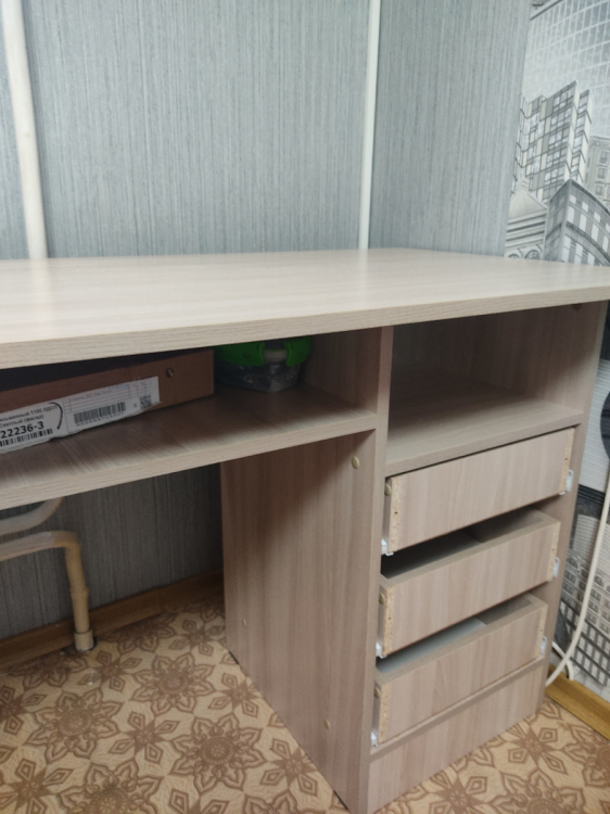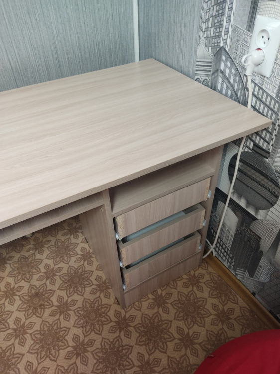 Нормальный письменный стол. Материалы хорошие, фурнитура на четверочку. Ручки для ящиков не подошли под намеченные отверстия, пришлось покупать отдельно. Гвоздики совсем слабенькие.; Достоинства: Хорошее качество материалов, стандартный размер.; Недостатки: Замудрёная сборка, дырка сквозная над тумбой с ящиками