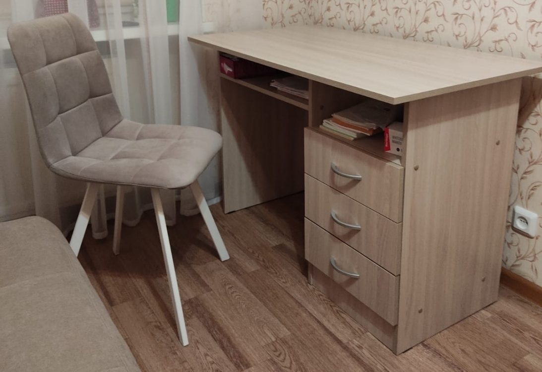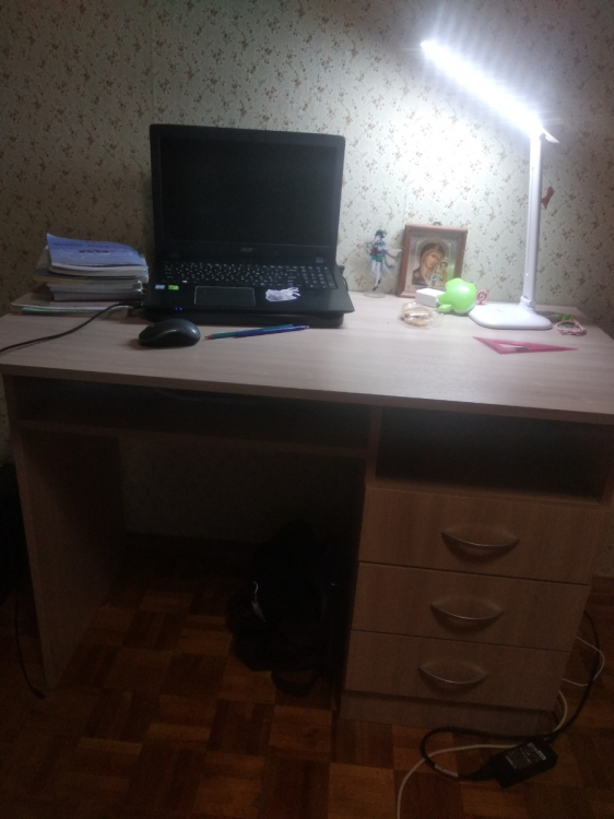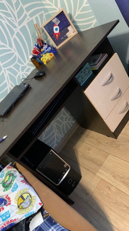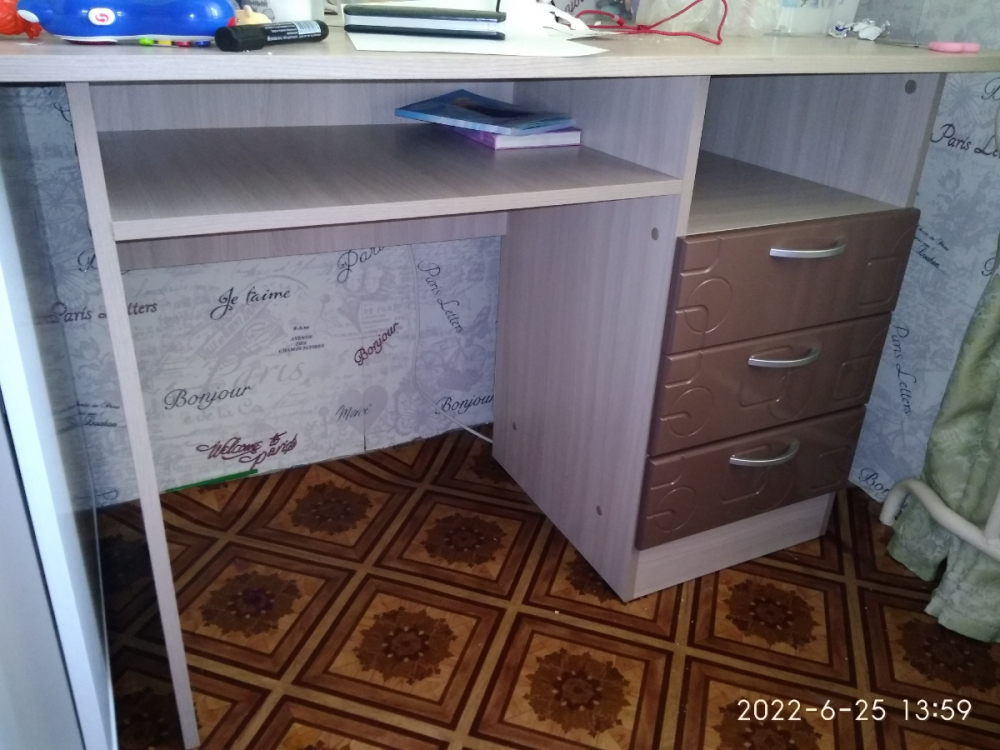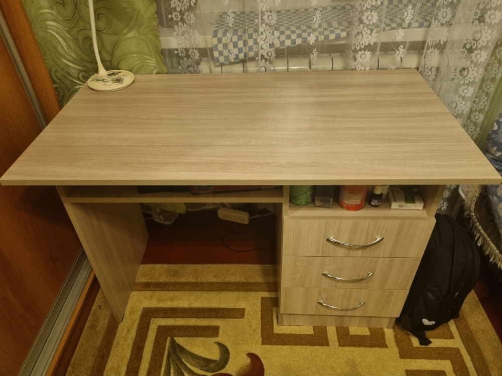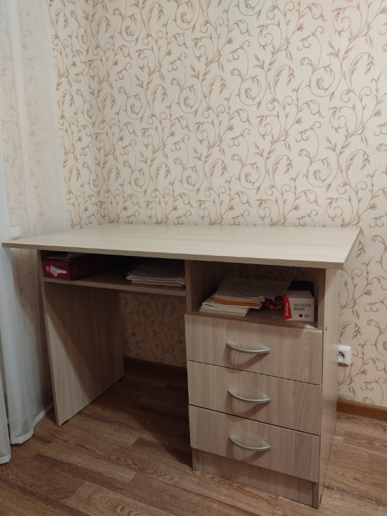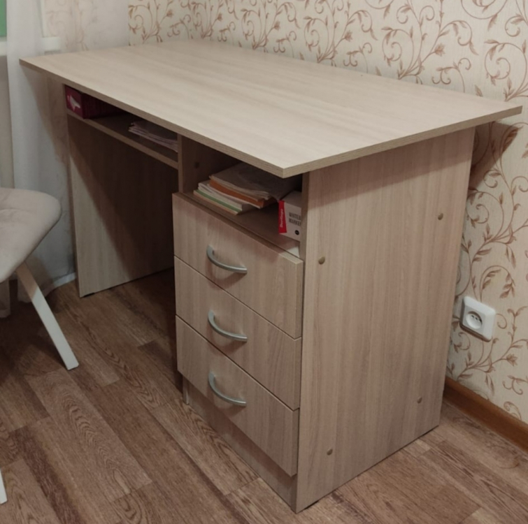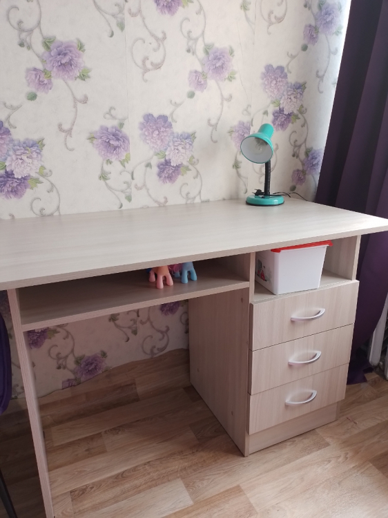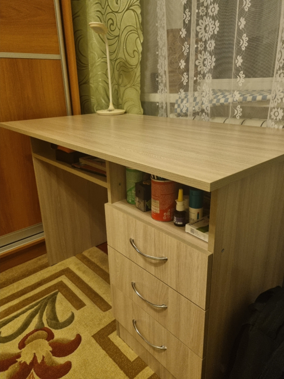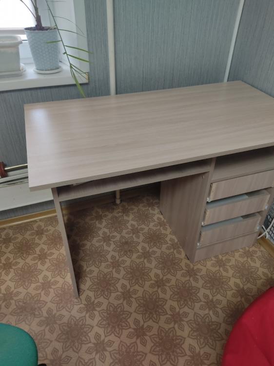 Стол хороший, для ученика младших классов вполне подходит. Брали в комплекте с кроватью.; Достоинства: За свои деньги очень хороший. Сколов не было, компактно упакован, все болтики, шурупчики имеются.; Недостатки: Инструкция - сломай мозг , но муж с сыном собрали за пару часов. Не смогли ровно поставить ящички, есть зазоры.