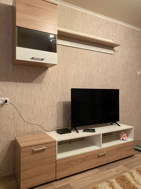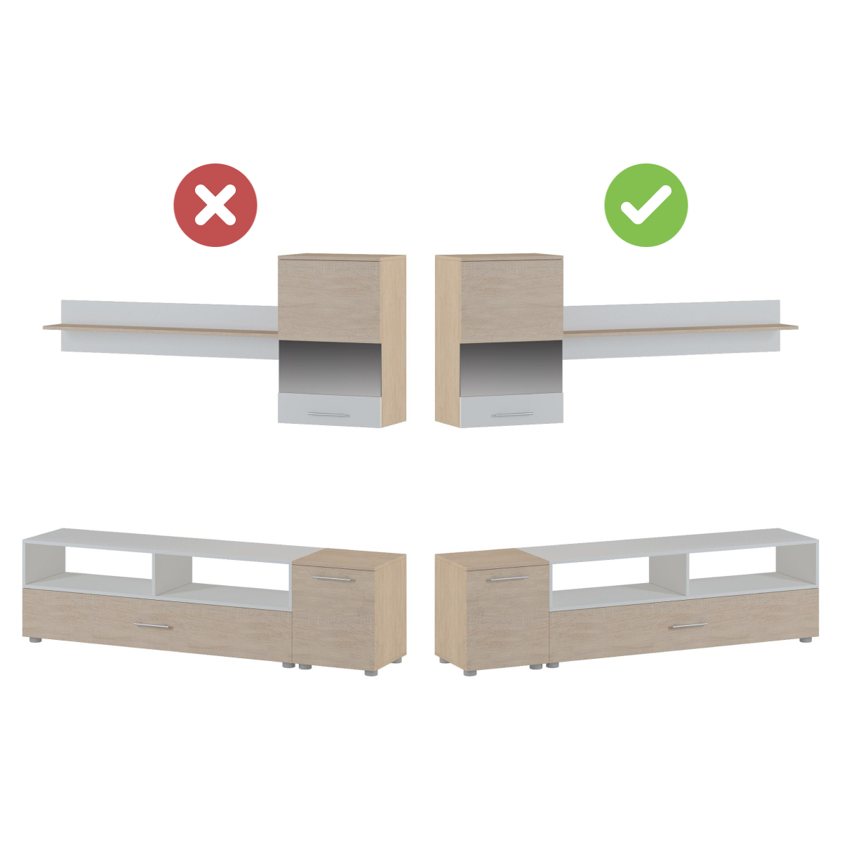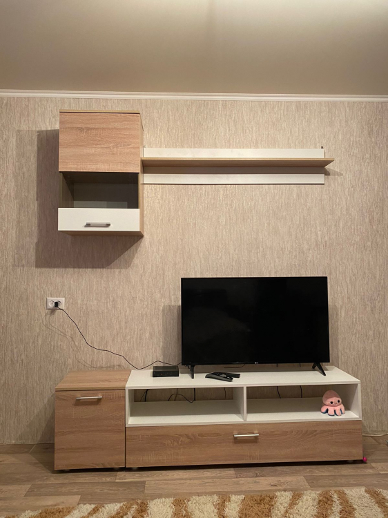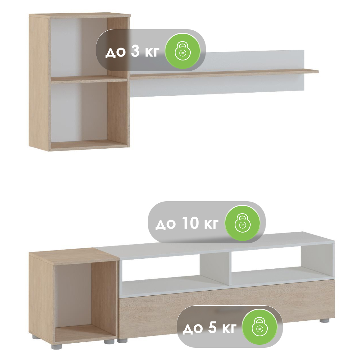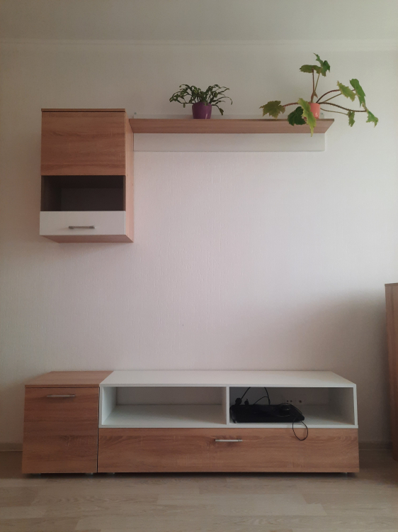 Все отлично, спасибо! Не первый раз заказываем в этом магазине. В этот раз со сборкой. Довольны! Набор состоит из 4 позиций. Можно разместить по-разному. Мы верхнюю полку повесили выше. Учитывайте, что нижняя тумба длинная и выдержит только телевизор (современный). Под большой тяжестью прогибается и мешает открывать ящик. Ящик внутри разделен перегородкой на два.