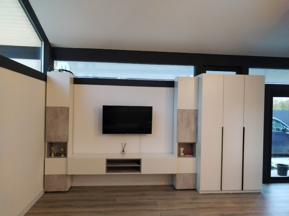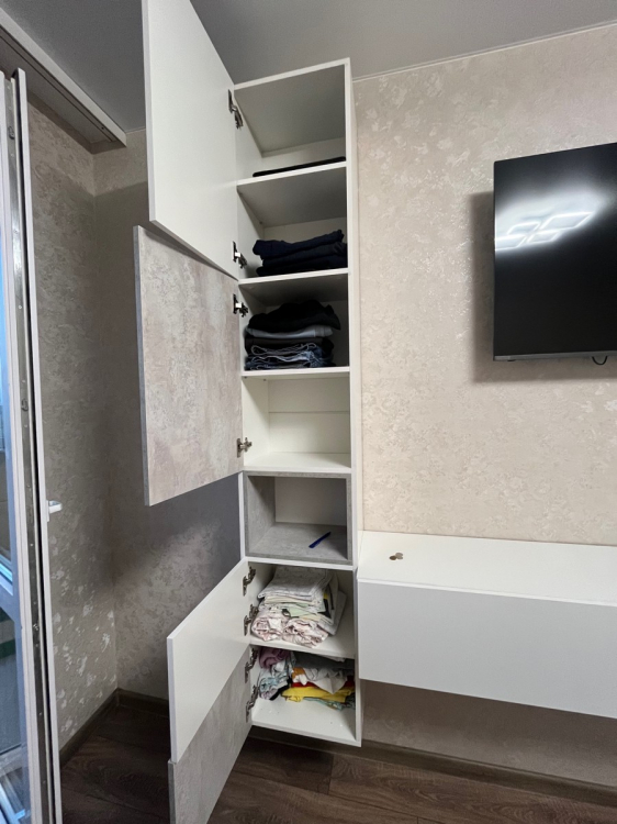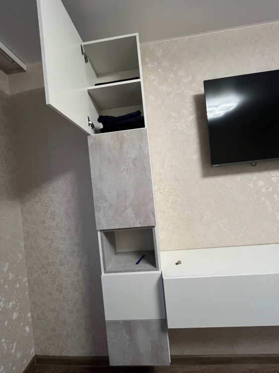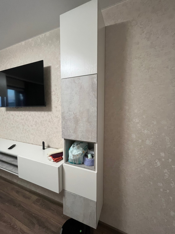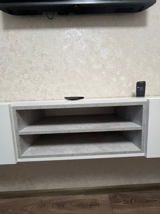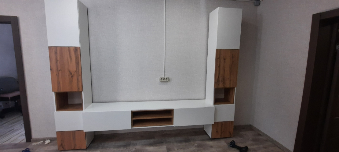 Очень красивая и стильная гостиная. Сделали её подвесной, как в предыдущем отзыве. Узкая, компактная, но достаточно вместительная. Планируем добавить сверху полочки и получится идеально. Хорошая доставка, все целое и невредимое. Все детали с запасом и выполнены качественно. Муж собрал без проблем за день.
