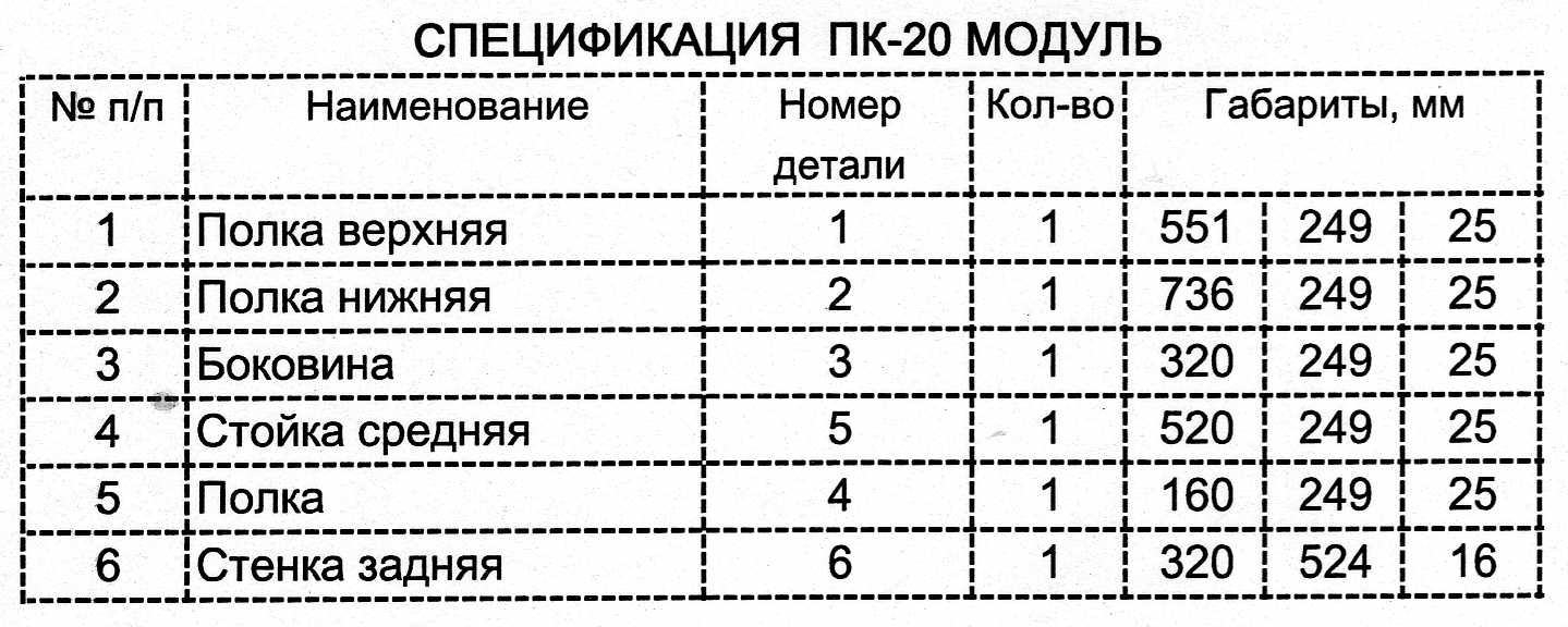 Полка состоит из 2х одинаковых модулей. Плита ДСП 25 мм.Схема сборки