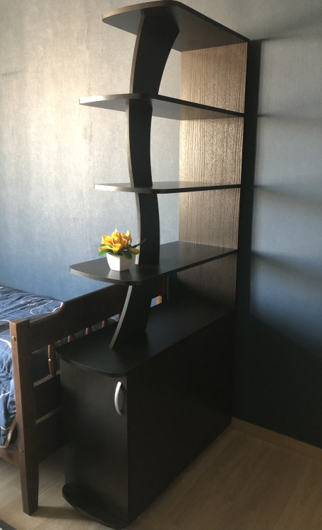 Стойка 5 изготовлена из ламинированной ДСП толщиной 16 мм, покрытой ПВХ кромкой (толщина 0,4 мм и 1,0 мм). Нижняя часть стойки представляет собой закрытую тумбу с двумя полками.Ножки НЕ регулируются по высоте.