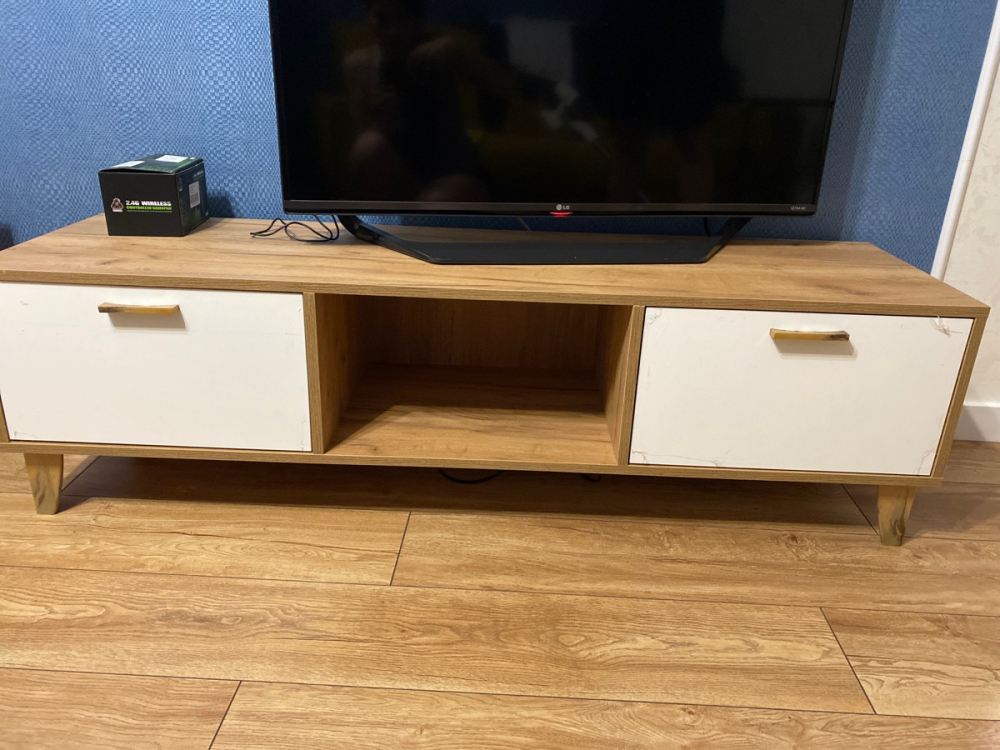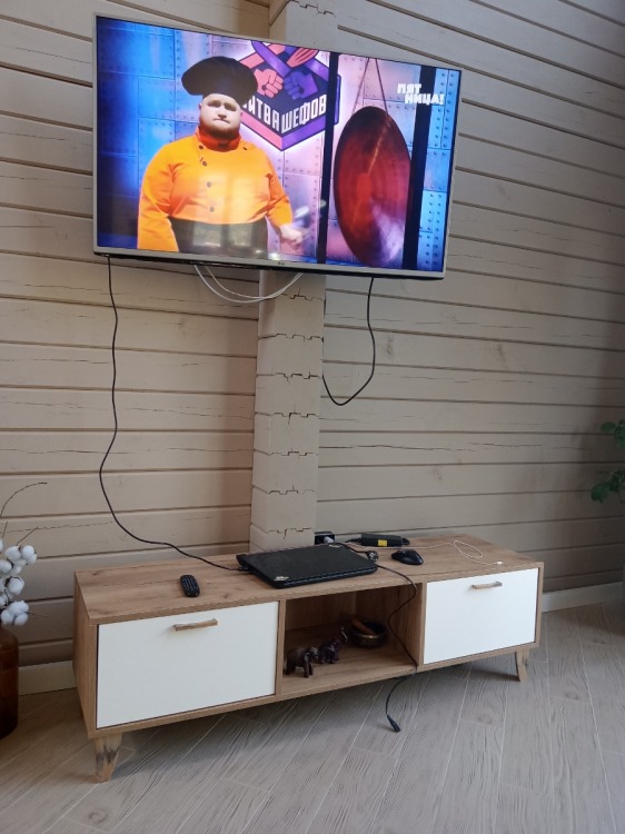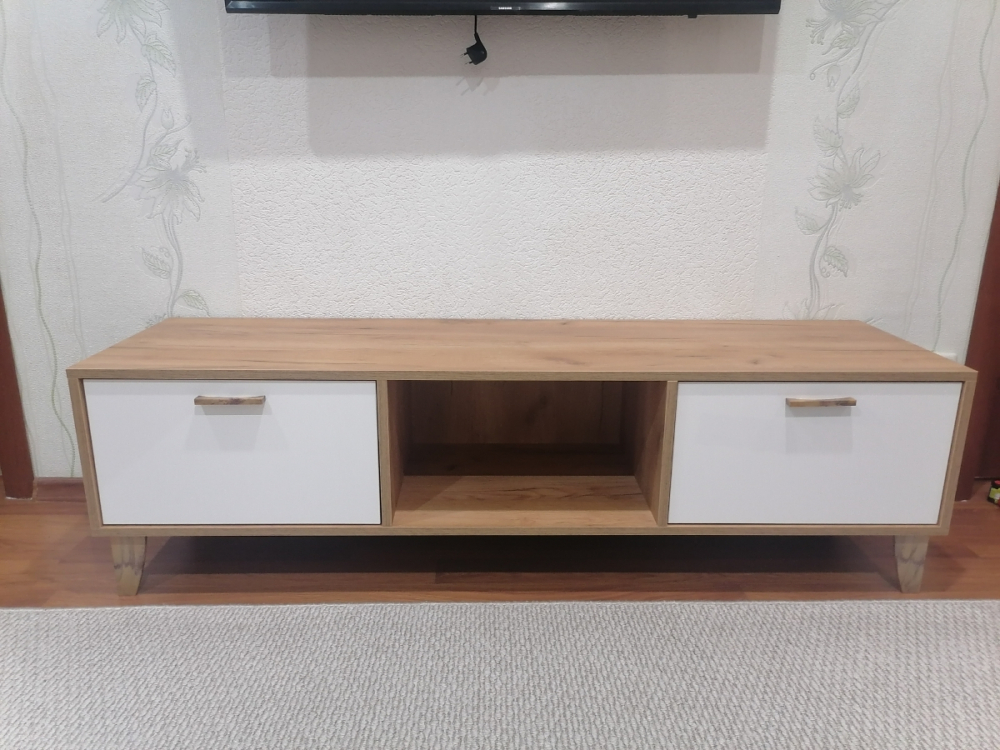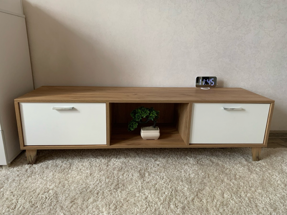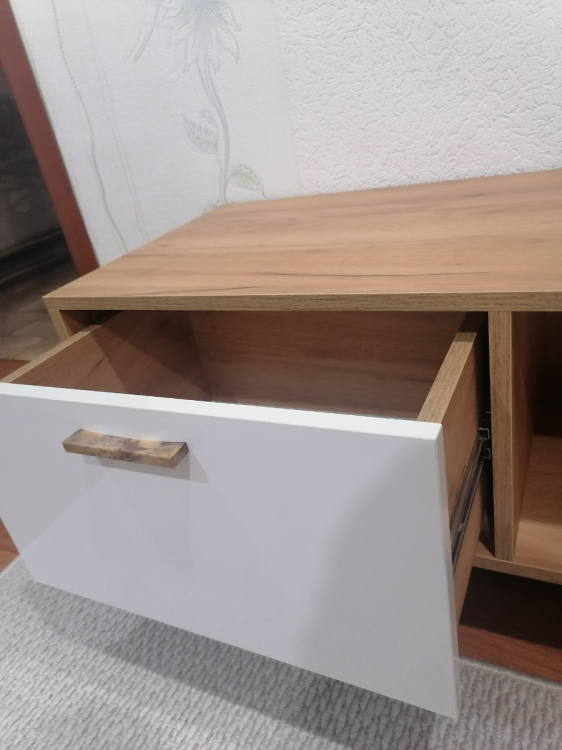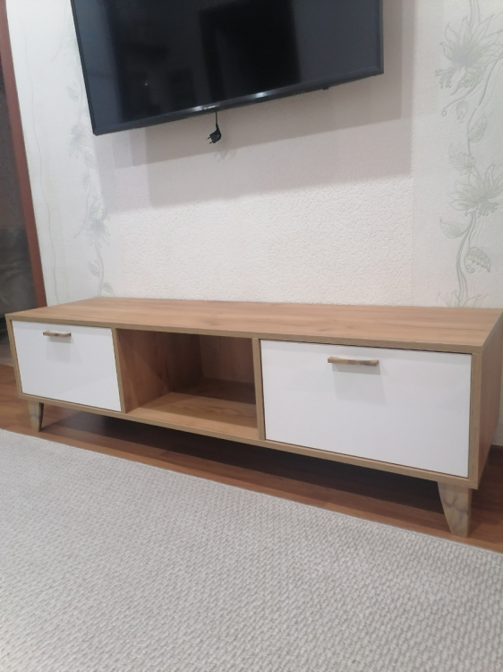 Хорошая Тв-тумба. Не возникло сложностей при сборке, детали довольно точно сделаны, подготовленные насверленные отверстия все хорошо совпали. Приятная расцветка у частей под дерево-тёплый светлый оттенок, белые фасады глянцевые. Ножки немного выбиваются по цвету и выдают, что это пластик. Возможно заменим на деревянные ножки позже. Доставка была быстрой, менеджер связывался несколько раз по телефону, чтобы обговорить сроки, привезли все в срок.; Достоинства: Приятная расцветка, неплохая фурнитура для данного ценового сегмента.; Недостатки: Для тех, кто не собирал мебель ранее, могут возникнуть трудности с инструкцией. Пластик на ножках немного отличается по цвету от основного фасада.