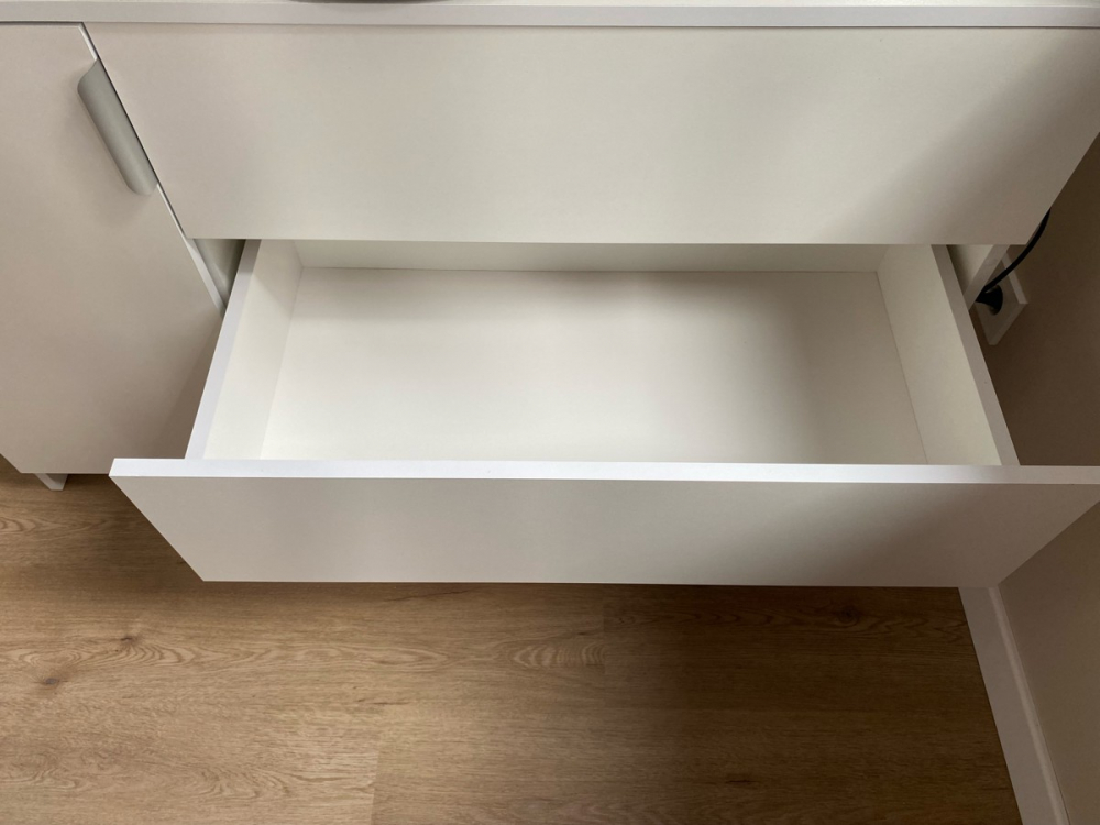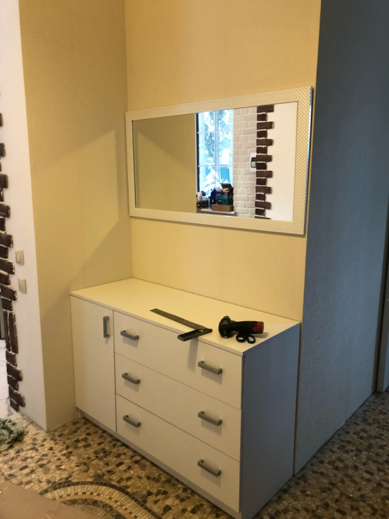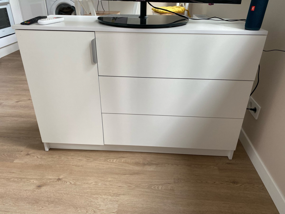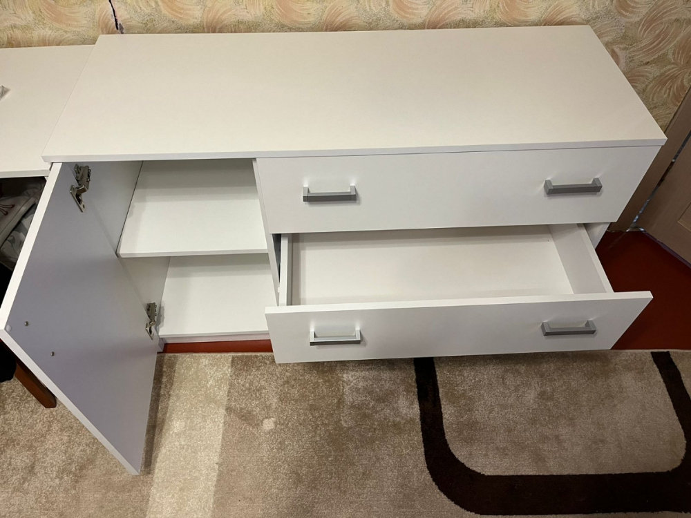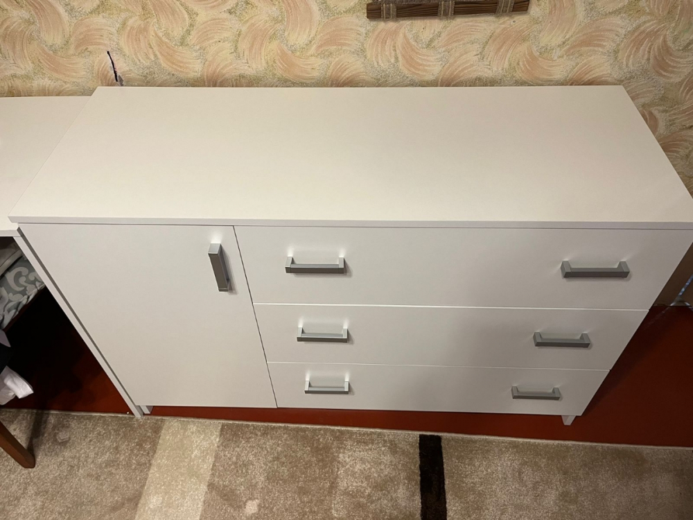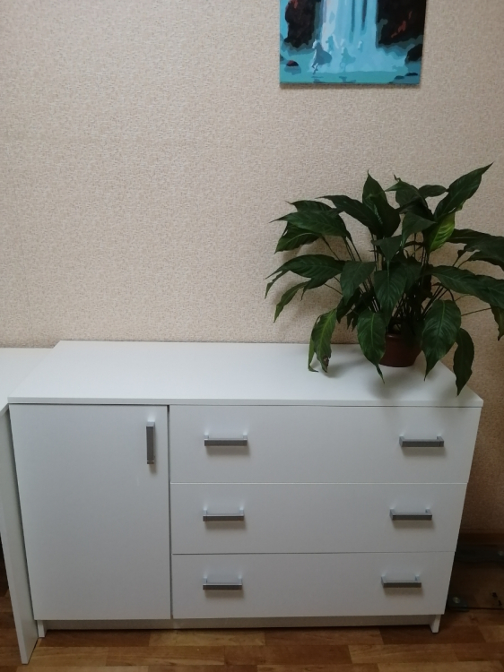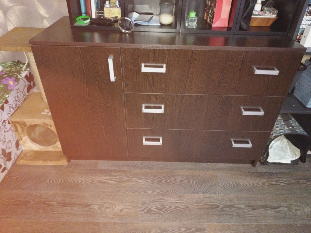 Достоинства: Хорошо упакован, понятная инструкция по сборке. Вписался в интерьер; Недостатки: Петли- нет регулировки дверцы по высоте. Фасады ящиков, отвестия для крепления стенок у трех ящиков 2+1 оказались не на одинаковом расстоянии, ошибка в 2мм. Торцы боковых стенок камоды (задняя часть) не заклеены кромкой.