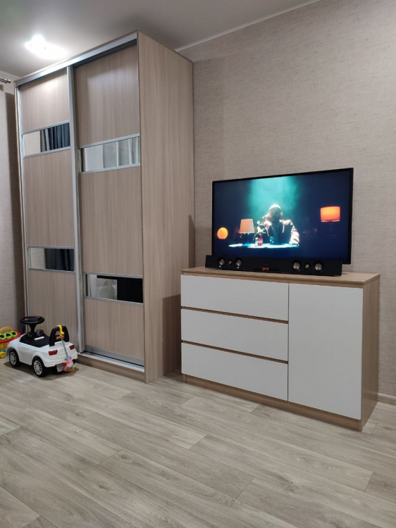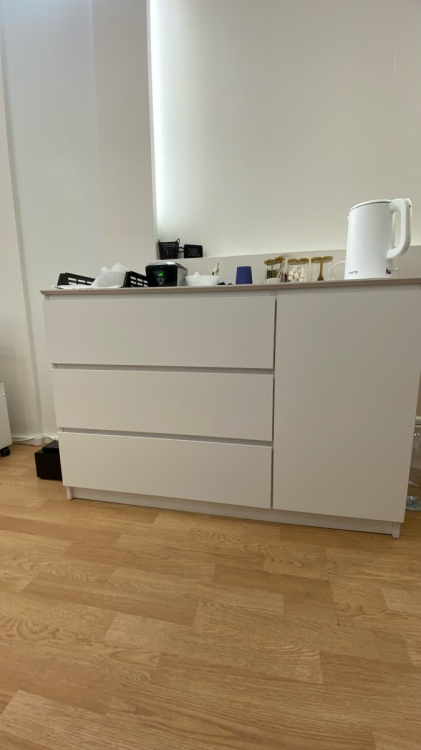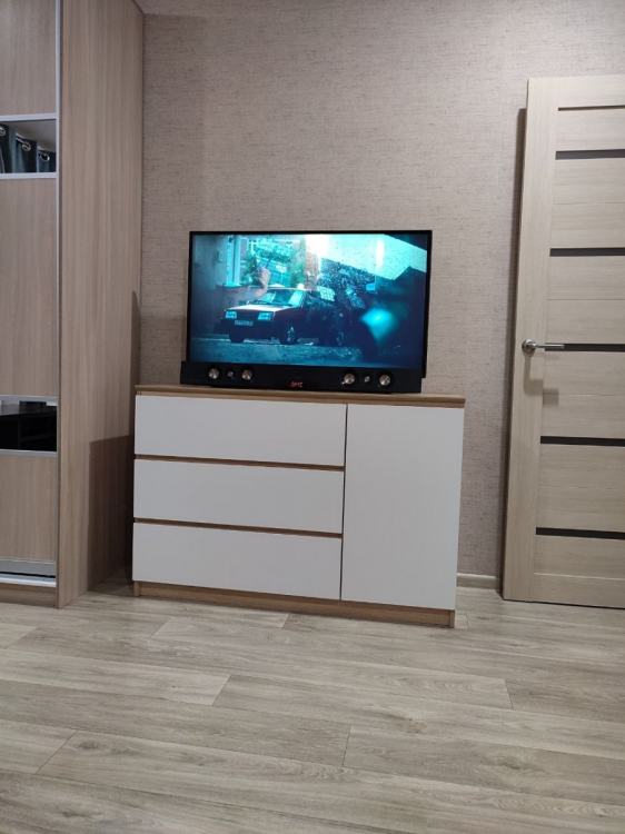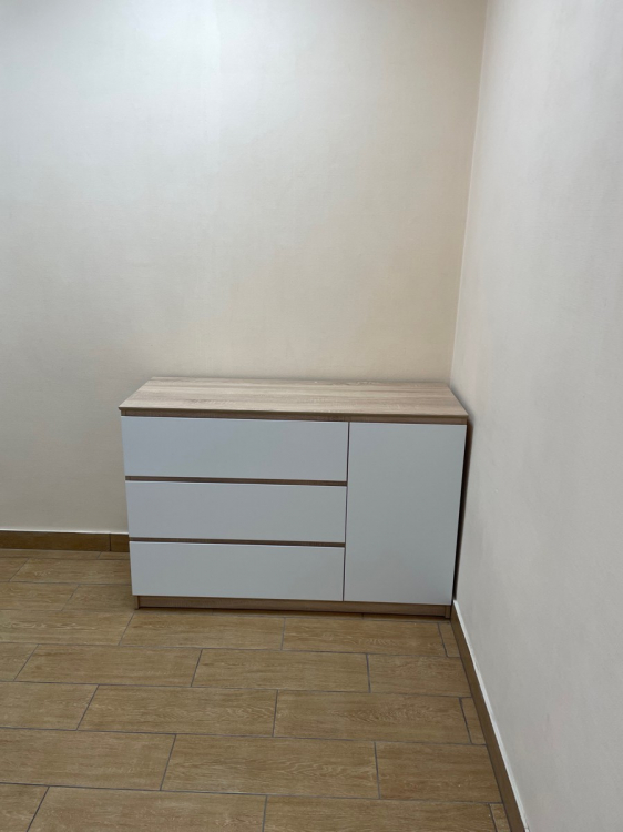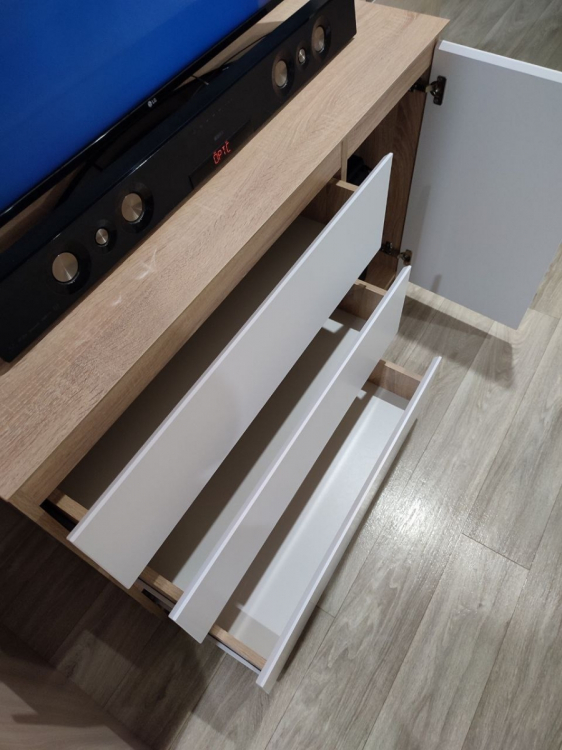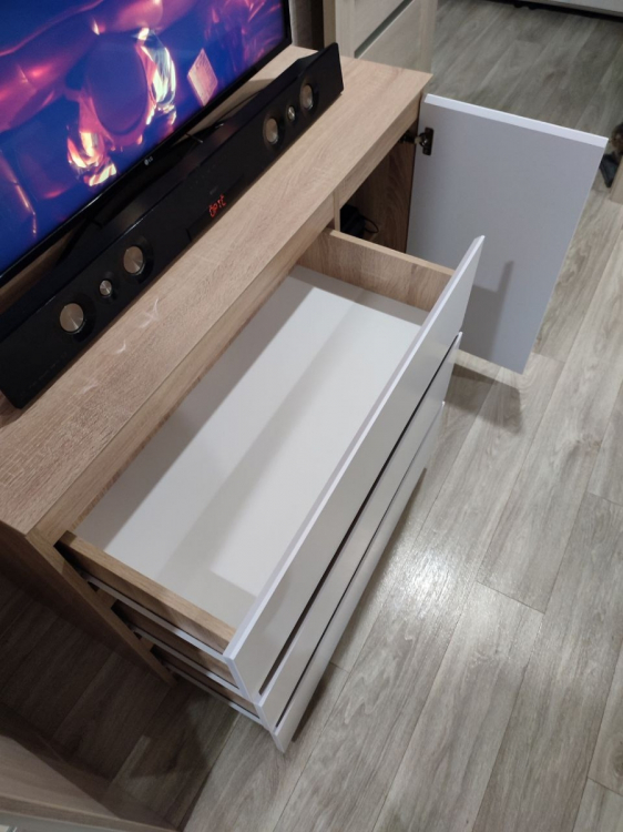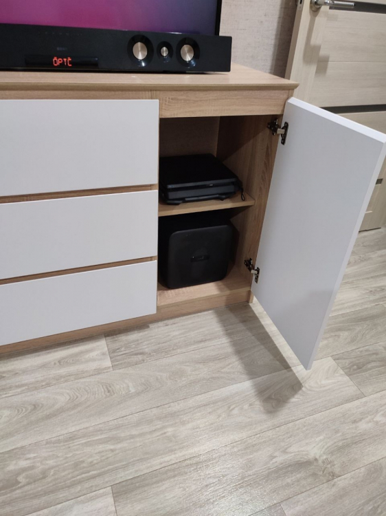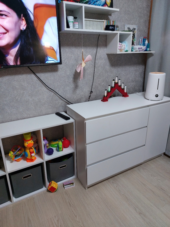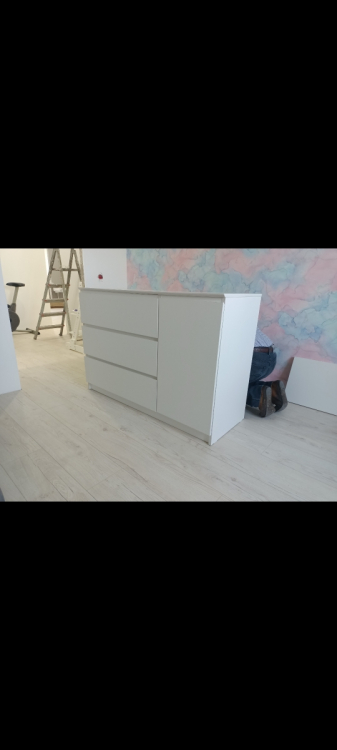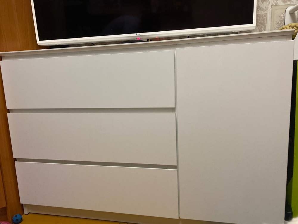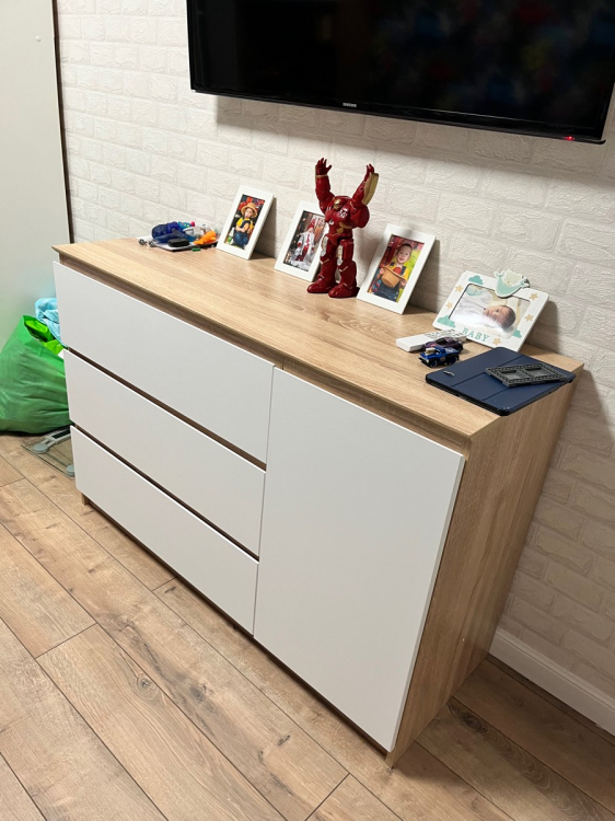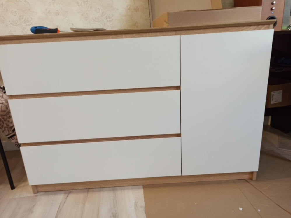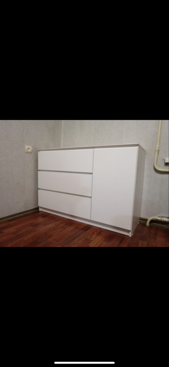 Нормальный комод, с учетом цены в 7 тысяч вообще норм. Муж собирал один, при креплении дна, лучше позвать помощника. У нас при сборке дно начало отламываться и раскрошился кусок дсп, в итоге вместо стяжки использовали в этом месте уголок.; Достоинства: Стильный, без ручек; Недостатки: ДСП скрошится при сборке