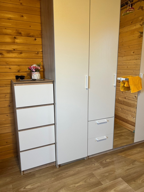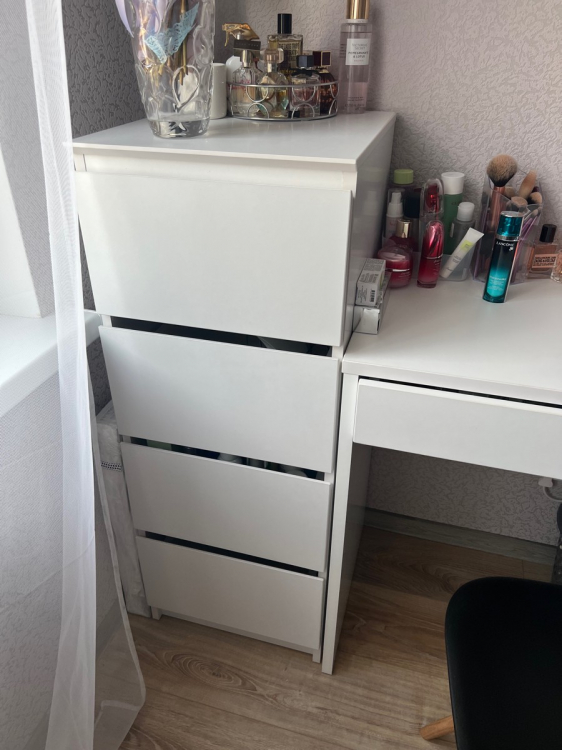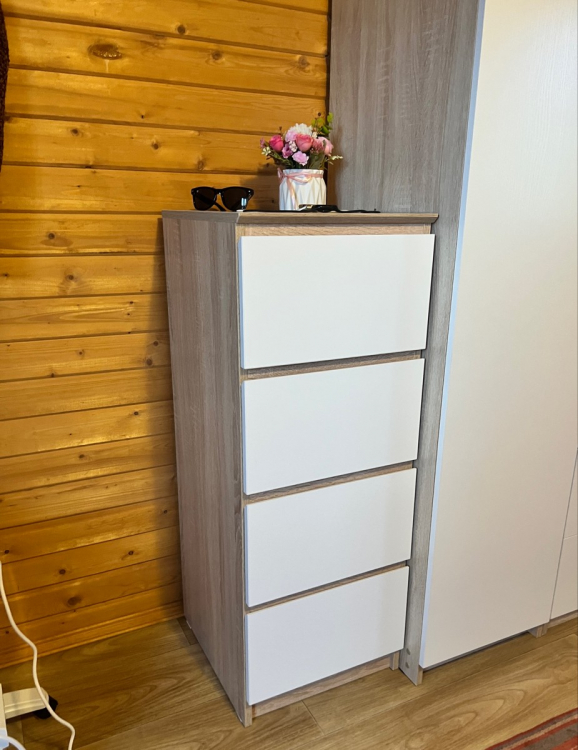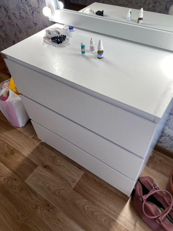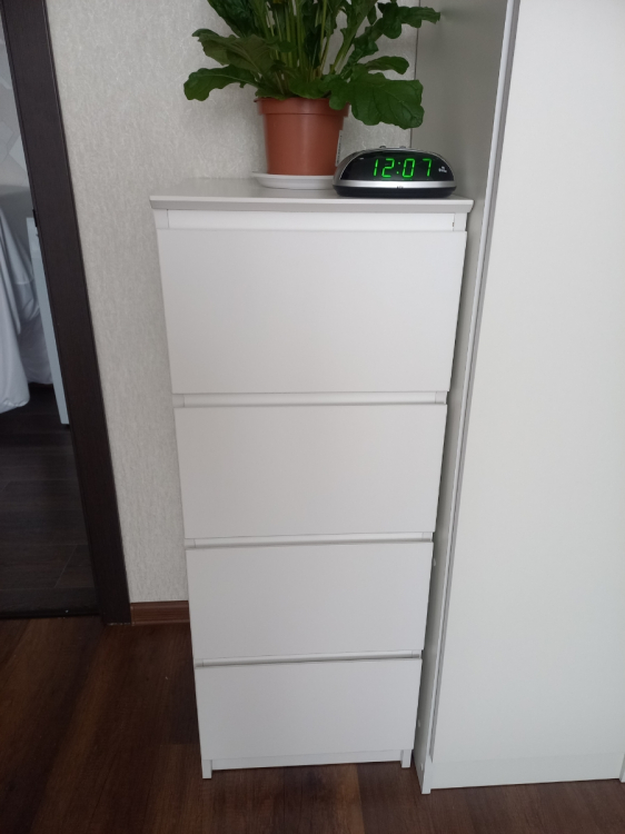 После заказа комода мне позвонили и договорились на счёт доставки. Привезли за 2 дня. Спасибо большое службе доставке и конкретно Геннадию. Ровно час от момента звонка о доставке и звонка в дверь. Сам комод компактный, внешне стильный, лаконичный. Внешние уголки немного скруглены. Ящики не особо глубокие - верхняя декоративная планка съедает полезное пространство. Но для хранения учебников, заколочек и рукоделия вполне достаточно. Для хранения одежды или чего-то объёмного думаю будет маловат. Дочь довольна ; Достоинства: Компактный; Недостатки: Не обнаружила
