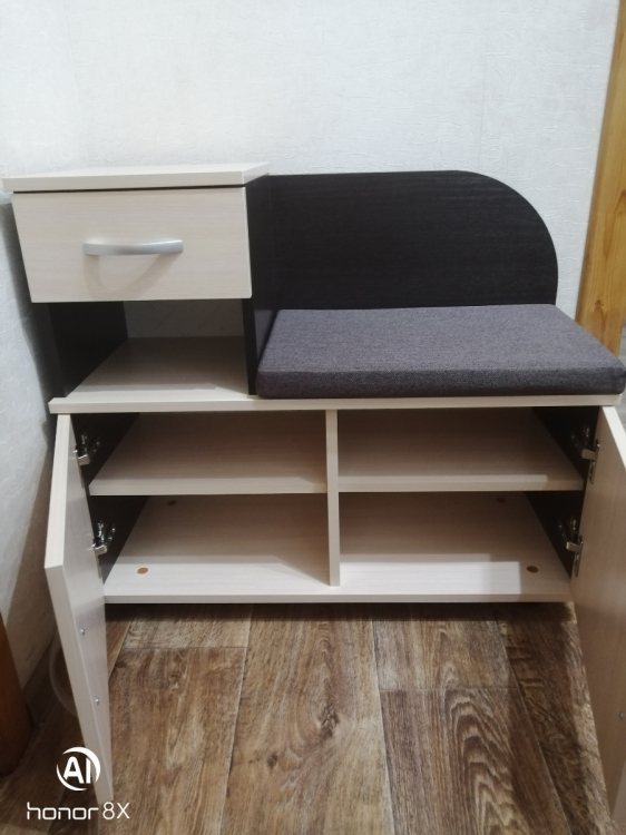 Специально искала обувницу с дверцами, чтобы прихожая выглядела окуратно. Очень удобна подушечка на сиденье, её можно закрепить. Обувницу удобно собирать, все заготовки пронумерованы и согласно инструкции легко собирать. Только отверстия для ножек были меньшего диаметра и пришлось отверстия рассверливать. За исключением этой маленькой неприятности, обувница понравилась.; Достоинства: Всё пришло целое без сколов и царапин; Недостатки: Отверстия для ножек меньшего диаметра