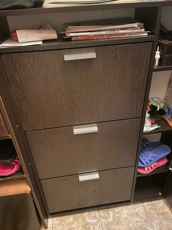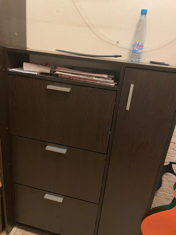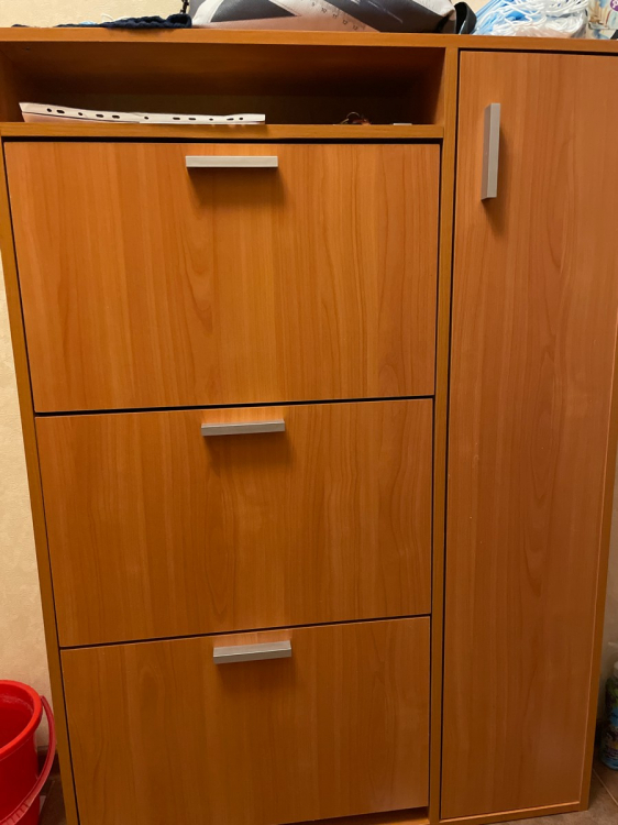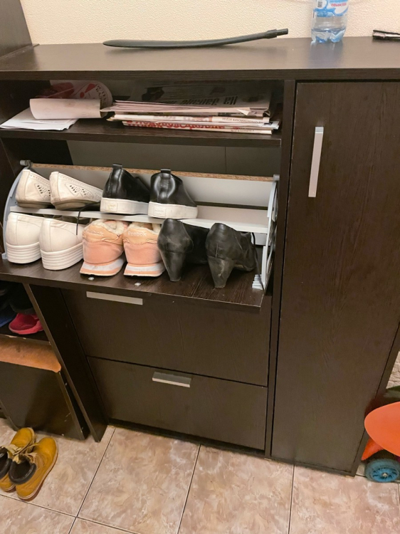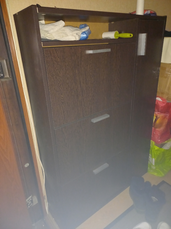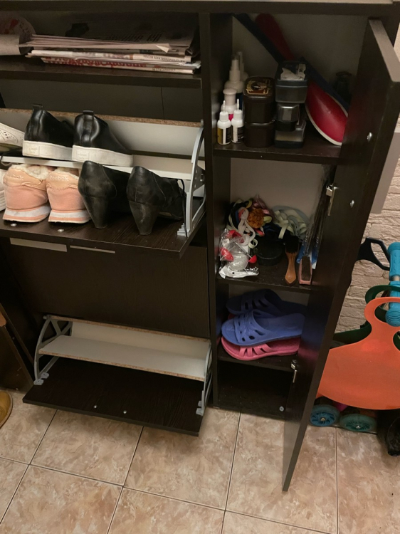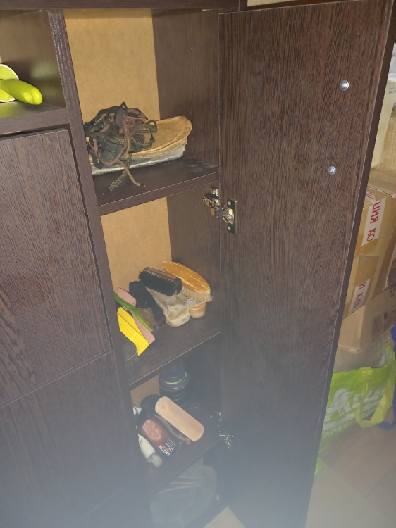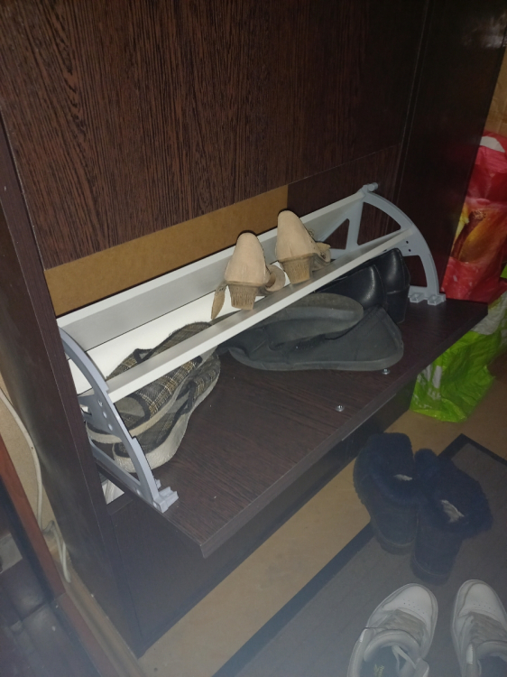 К самой обувнице не претензий. Была проблема в комплектации, но её решили на следующей день . Обувница прекрасно встала в узкий коредор , а благодоря семным полкам прекрасно поместилась крупная обувь. Полки сбоку очень помогли в хранении разных мелочей для обуви; Достоинства: Тонкая высокая и с большой вместимостью.; Недостатки: недостатоков нет