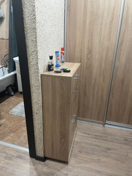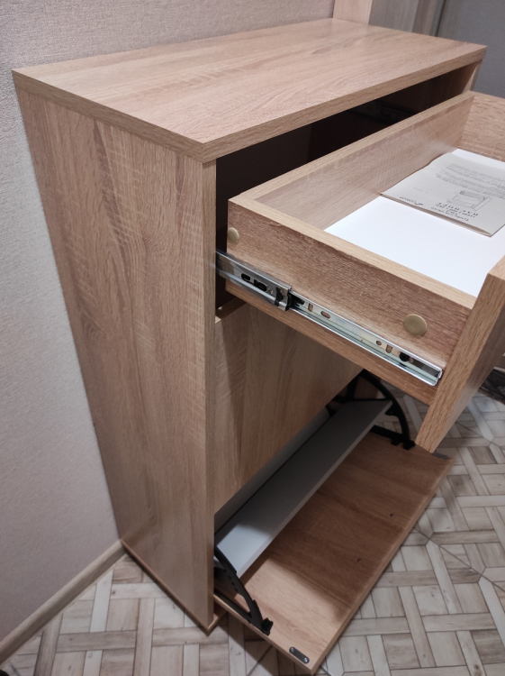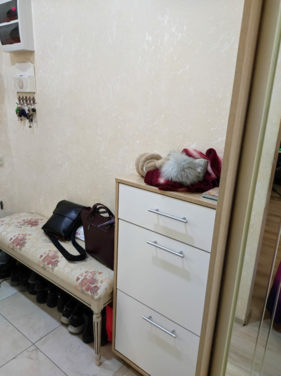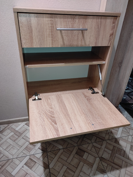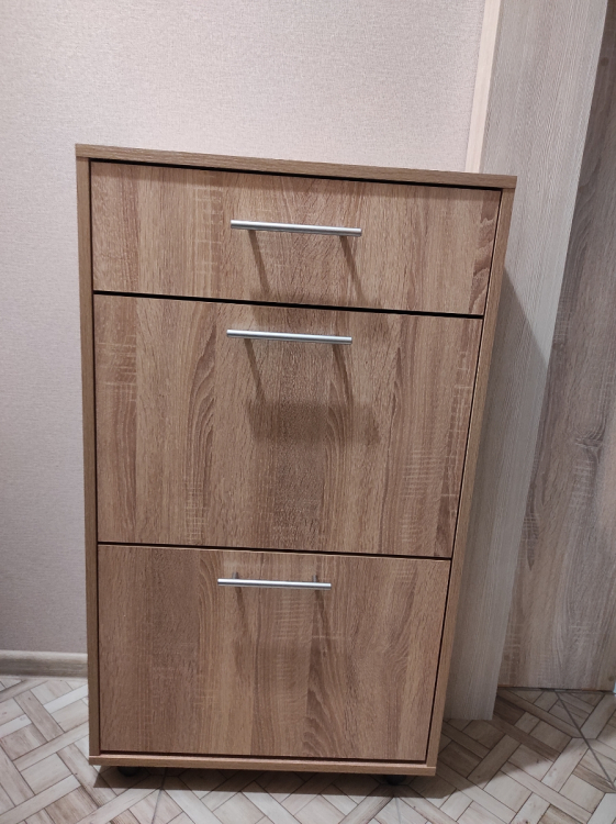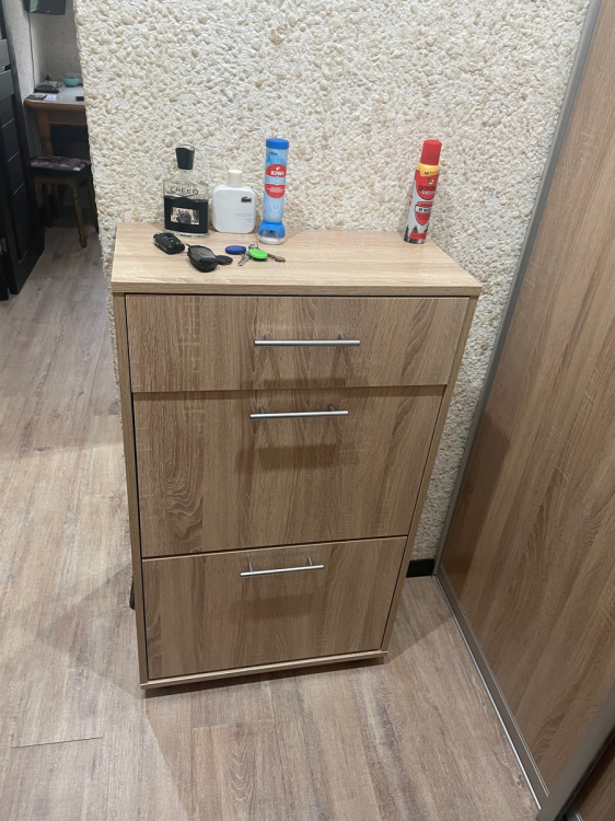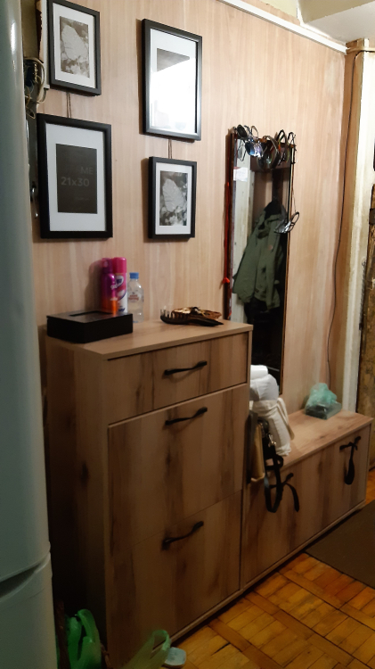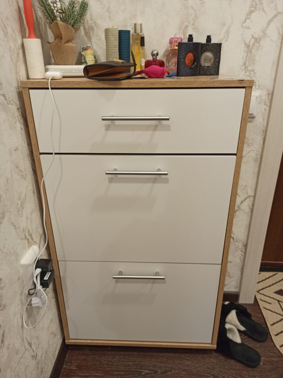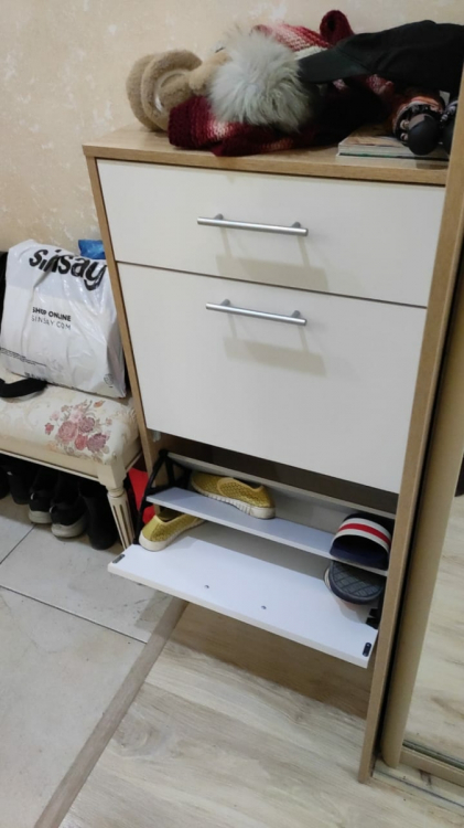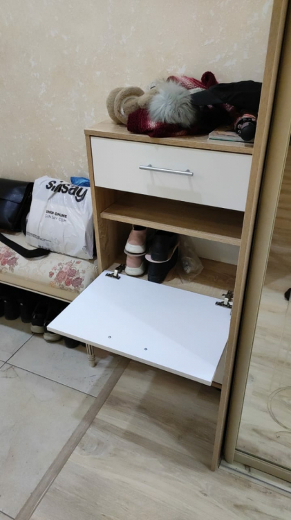 Нашим котам она тоже пришлась по душе, сейчас это коронное для них место; Достоинства: хорошо вписалась в наш интерьер и узкий коридор, в который мы ничего не могли поставить. Внутренность вместительная: низ для тапок, среднюю полку можно использовать для обуви,верхний выдвижной ящик подходит под разные мелочи; Недостатки: был скол на самом видном месте, пришлось приклеить.