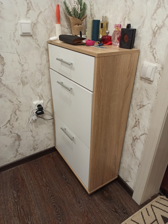 Особенности:- Сидеть можно только на закрытой тумбе;- ЛДСП 16 мм;- Отделывается кромкой ПВХ 0.4 мм;- Максимальная нагрузка на верхнюю часть: 100 кг.Обувница встала прям идеально по параметритам. Нам было важно, что бы дверь полноценно открывалась и ей ничего не мешало. 1. Удобный выдвижной ящик для мелочи. 2. Полностью откидная дверца. Сапоги я бы конечно туда не ставила, но поставив туда пару органайзеров или средства для обуви- идеально. 3. Самая нижняя рассчитана только для тапочек. Не думаю что туда может вместится что то больше :) По качеству сборки. Вместо мини гвоздиков, саморезы для задней стенки - это не очень удобно. Инструкция была в комплекте
