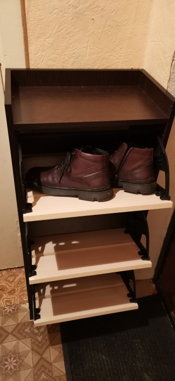 Красивый дизайн, удобная конструкция, в целом внешний вид и качество материалов отличные, за данную стоимость. В моем случае главным критерием были габариты обувницы, очень порадовало что все детали соответствуют заявленным размерам. К сожалению не обошлось без минусов... В описании указано, что обувница рассчитана на 6 пар, вроде бы все логично, 3 отделения, по 2 пары на каждую. Тут и возникли проблемы. Если размер обуви больше 41,то разместить по 2 пары на полку не получиться, дверца просто не закроется. Зимняя обувь того же 41 уже не влезает. Единственный вариант - убрать планки в отделении и расположить обувь горизонтально или под наклоном в сторону. По факту вместимость данной обувницы - 3 пары любой обуви и 6 пар, при условии небольшого размера стопы, а так же задника обуви, ибо все похожее на полу ботинки не влезут, только 1 пара на отделение при определённом расположении, как описывал ранее. Всего один минус, но на мой взгляд достаточно большой и может испортить впечатление, учитывая что в описании по этому поводу нет никакой информации. Возможно для детской обуви это то что нужно и не возникнет никаких вопросов, но опять же в описании не написано что данная обувница рассчитана преимущественно для детской обуви. Ещё можно на всякий случай добавить в комплект крепление к стене для предотвращения падения, кому то очень может пригодиться. Подведу итог : по соотношению цена-качество и если важны малые габариты, то это отличный вариант для покупки, но будьте готовы что поместиться не вся обувь, не всех размеров и не в максимально заявленом количестве. Всем добра и хороших покупок.