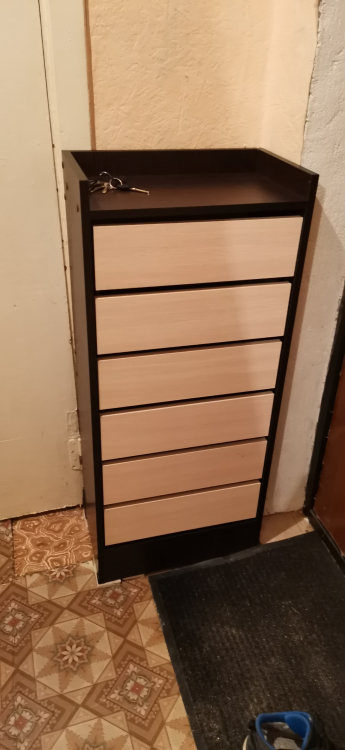Узкая, ёмкая Обувница узкая, высокая, хорошо вписывается в небольшой угол прихожей. Светлый цвет обклейки визуально увеличивает площадь угла. В нескольких полках не ставили среднюю планку, оставили одно отделение. Верхнее отделение вполне можно использовать как ящичек для вещей. К покупке рекомендую.