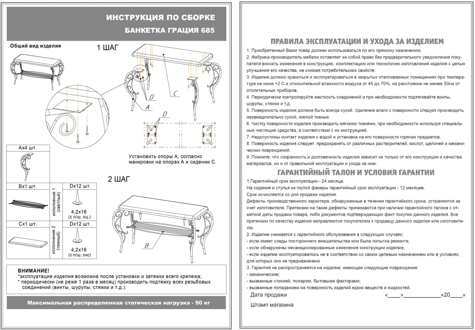 Каркас выполнен из металлической трубы, диаметром 16 мм. Порошковая окраска изделия, стойкая к механическим повреждениям. Максимальная нагрузка на банкетку 90 кг, на полку 7 кг.Схема сборки