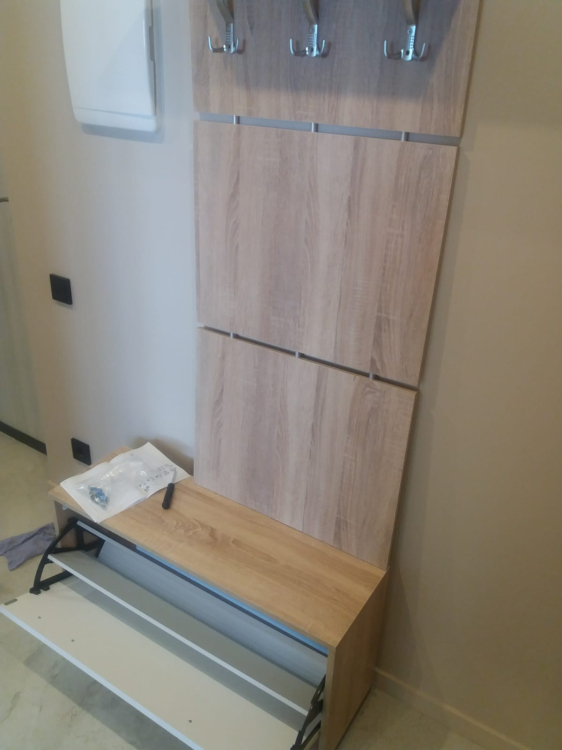 Достоинства: ширина, размер крючков. Покупал вешалку из-за ширины (600 мм), а вот длина это только минус к стене плотно не прилегает, даже если она идеально ровная. Недостатки: заглушки которые идут в комплекте пришлось подрезать, так не влезли в отверстия. Отдельный момент с монтажом, если вешать по инструкции, то в дюбеля идущие в комплекте, стяжки не закрутить, не подходит диаметр только если в мягкую стены. В целом за эти деньги в пол не красивая и функциональная вешалка.
