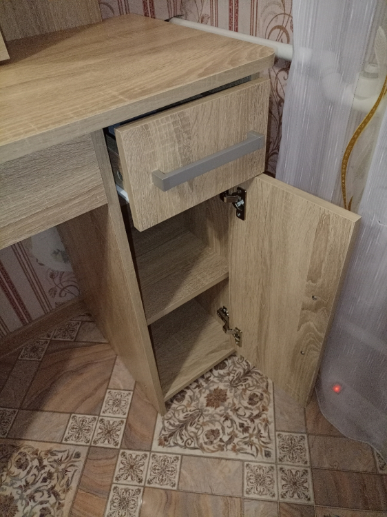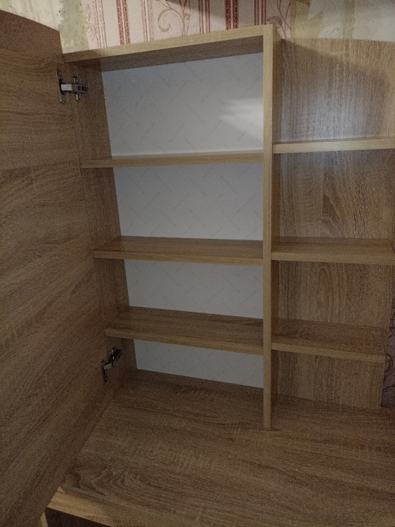 Аккуратный и компактный, по размерам подошел тютелька в тютельку. По цвету думала немного другой будет, чтобы подходил под все остальное, но тут зависит от освещения. Собирали часа три); Достоинства: Много полочек, искала специально, чтобы за зеркалом были полки.; Недостатки: Инструкции нет в наборе. Пришлось в интернете искать видео. Петля одна пришла погнутая, пришлось самим плоскогубцами разжимать.