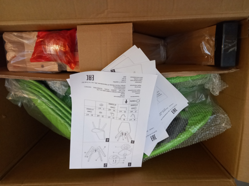 1. Выложите все содержимое коробки: сидение, 2 ножки, фурнитуру и 1 шестигранник.