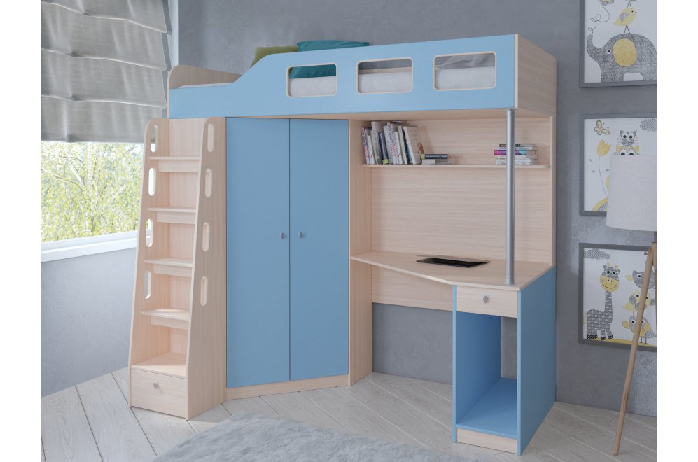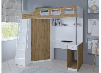 Кровать-чердак Астра 7 сочетает в себе полноценное спальное место с удобной рабочей зоной. Удобство доступа на верхний ярус обеспечивает удобная лестница с металлическими ступенями. В основании лестницы расположен ящик для детских принадлежностей. Рабочая зона располагает удобным столом, полкой для книг и местом для системного блока компьютера. Так же слева от стола расположен удобный, вместительный шкаф для одежды. Наполнение шкафа: 3 полки, штанга для одежды. Сборка: на обе стороны.Схема сборки