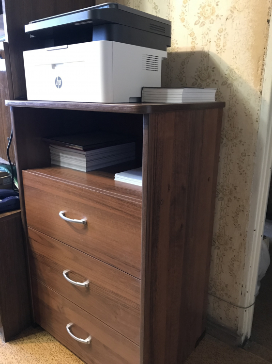 Комод изготовлен из ЛДСП толщиной 16 мм. Выдвижные ящики установлены на роликовые направляющие. Углы крышки комода закруглены и отделаны как и передние кромки боковых щитов комода гибким П-образным кантом ПВХ.