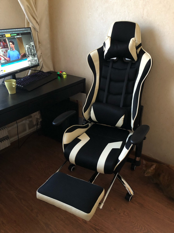 Купила мужу-заядлый игрок, ему очень нравиться, он ростом 2 м, подставка для ног лишняя, подушки удобные, цвет приятный, не марается, летом тело не патеет.; Достоинства: Удобное, красивое; Недостатки: Подставка для ног лишняя, неудобно держать так ноги