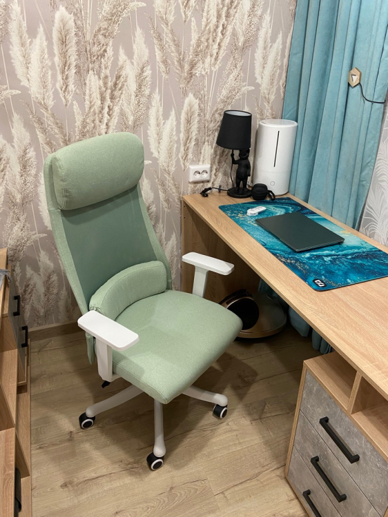 Неплохой офисный стул! Симпотичный дизайн, стильное цветовое решение и приятный материал. Человеку ростом 180 см сидеть на нем очень комфортно благодаря хорошей поддержке спины и удобным регулировкам, но вот жене ростом 160 неудобно - подголовник не на месте. Этот стул стал идеальным дополнением к моему рабочему месту. Снимаю звезду за то, что пришел с пятном.; Достоинства: Красивый, бюджетный; Недостатки: Мало регулировок, пришел с пятном