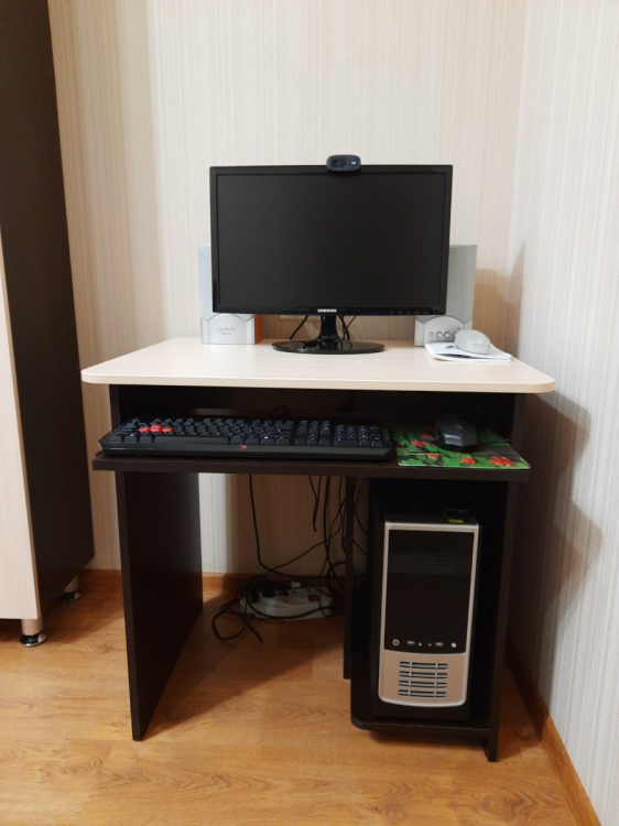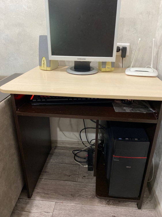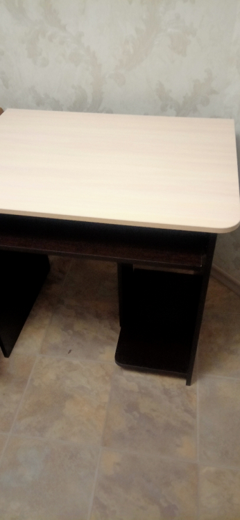 Хороший , аккуратный стол ) я бы сказала компактный, всё входит и кружка с кофе и клавиатура , но места занимает не много) комплектующие в целости и сохранности. Ни сколов ни царапин на стенках. Пользуемся уже два месяца - Остались очень довольны покупкой .; Достоинства: цена качество - прекрасно ) на этом цвете не очень пыль заметна; Недостатки: нет