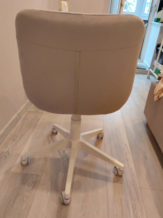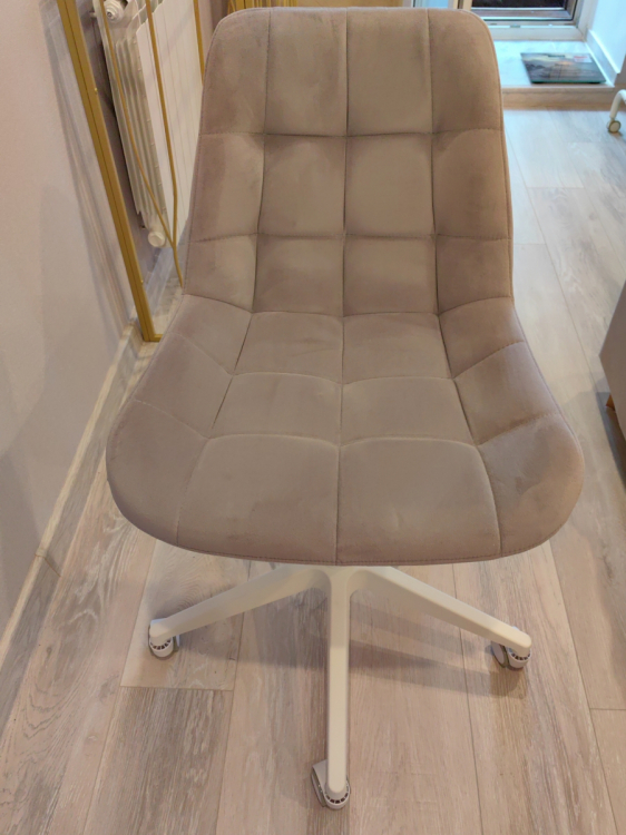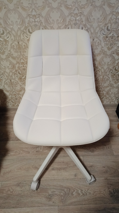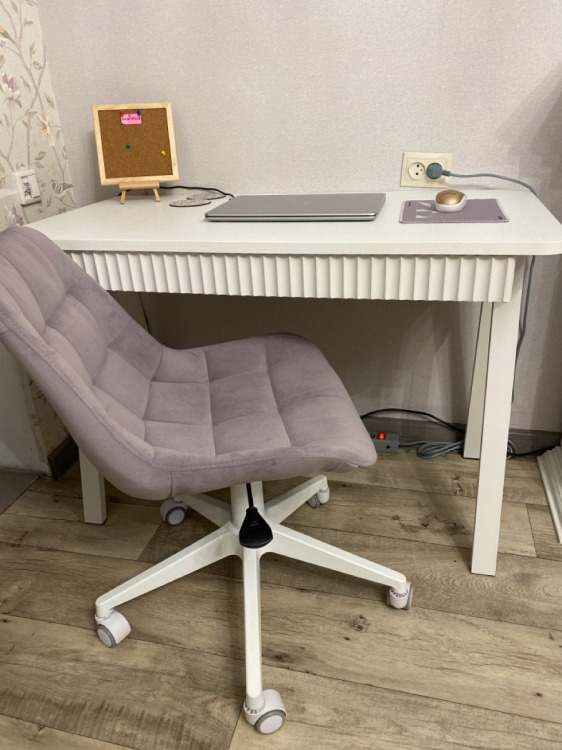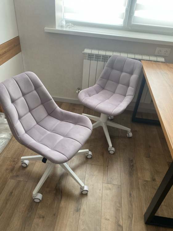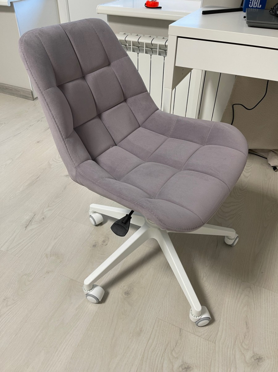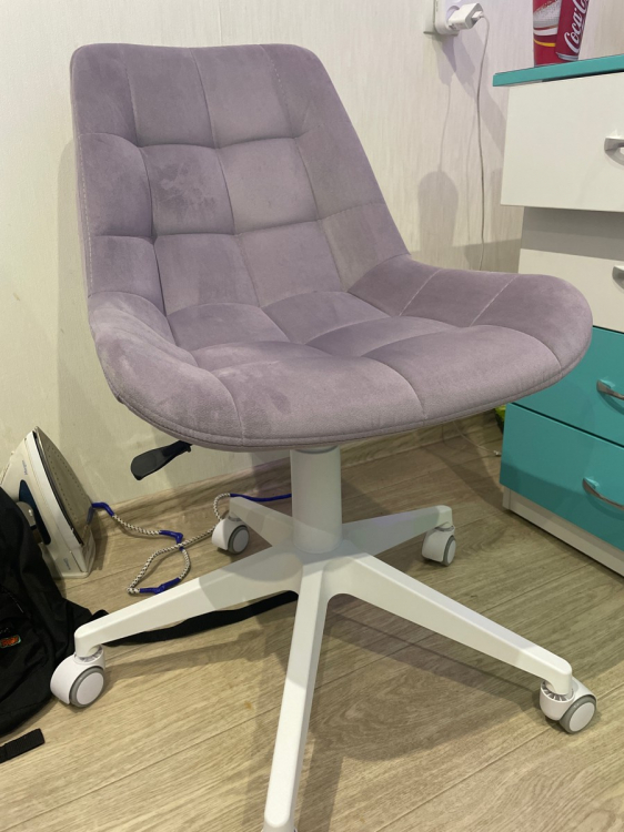 Сидеть удобно; Достоинства: Очень красивый лилово-сереневый цвет, спокойный. Сама ткань приятная на ощупь. Простегана ровно. Сзади молния, то есть можно снять ткань и постирать.; Недостатки: Чтобы расстегнуть молнию придется открепить сначала ткань, которая находится внизу стула, там , где крепление. Это очень неудобно. И саму ручку подъёмного механизма можно было также сделать белой, как и основание на колесах, а не чёрной.