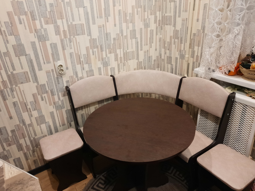 Обивка стульев и дивана выполнена из экокожи. У материала прекрасные эксплуатационные характеристики. Он прочен, износоустойчив, хорошо переносит воздействие влаги, температурные колебания в помещении, механические воздействия. При почти полной идентичности натуральному аналогу экокожа более плотная, устойчивая к истиранию и дольше служит при условии бережного обращения. Демократичная цена делает мебель, выполненную с применением экокожи, доступной для широкой категории покупателей. Для удаления небольших загрязнений с кожаной поверхности можно использовать любое мягкое моющее средство с водой или мыльный раствор.
