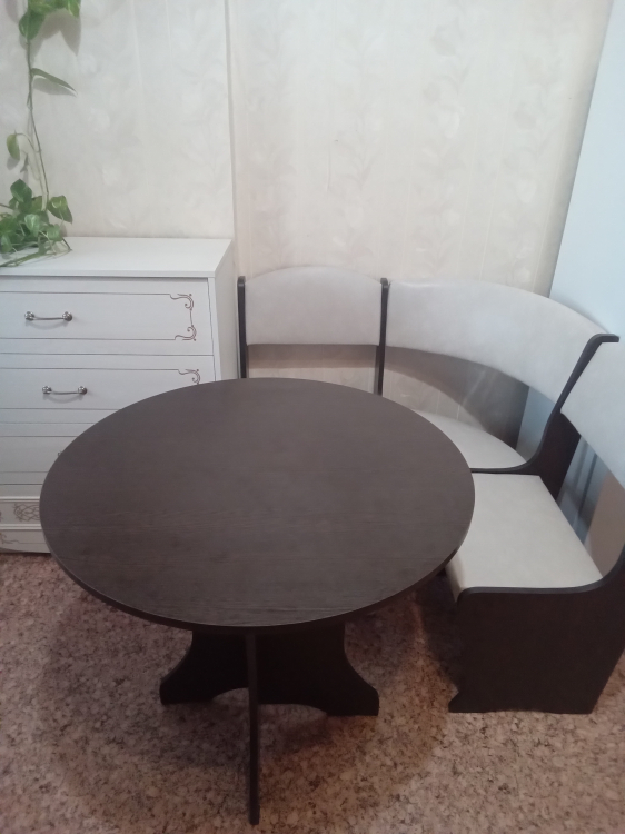 Стол, каркас дивана и стульев изготовлены из ламинированного ДСП. Материал создается на основе натуральных древесностружечных плит с использованием безопасных связующих составов. Даже после долгой эксплуатации мебели ЛДСП не выделяет вредных и опасных соединений. ЛДСП обладает рядом преимуществ. Он прочен, износостоек. За счет меламиновой пленки, нанесенной на поверхность, довольно нейтрально переносит воздействие влаги, температурные колебания в помещении. Прост в уходе: для поддержания чистоты достаточно протирать поверхность влажной салфеткой без использования агрессивных чистящих и моющих средств.