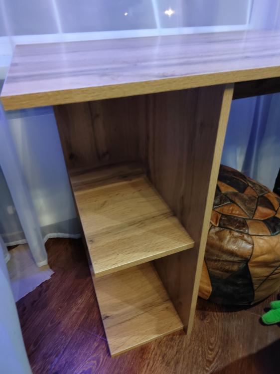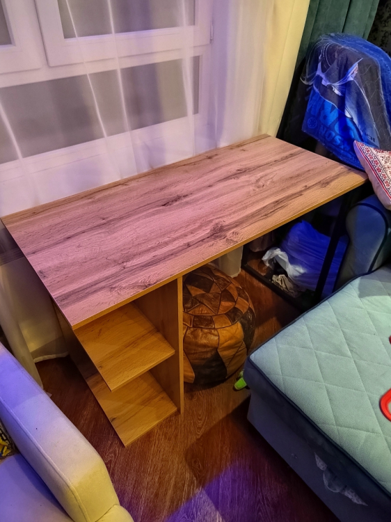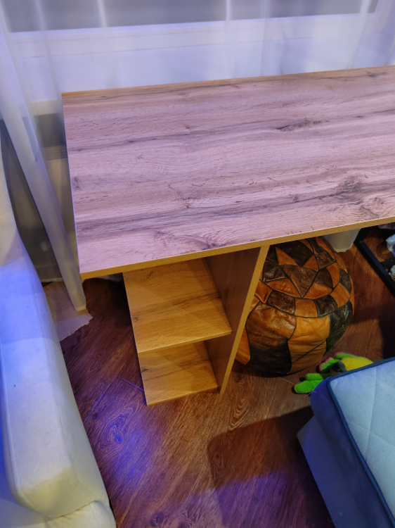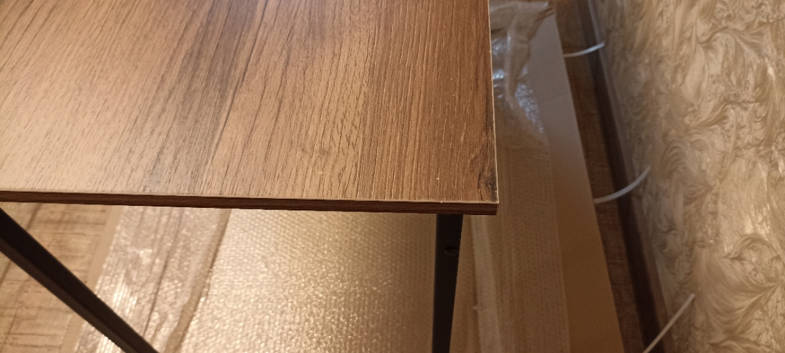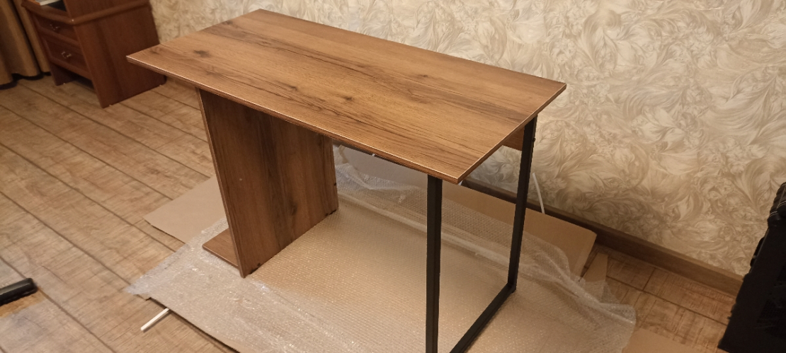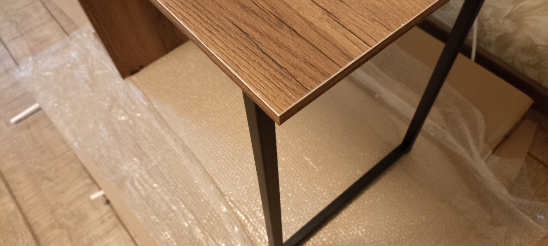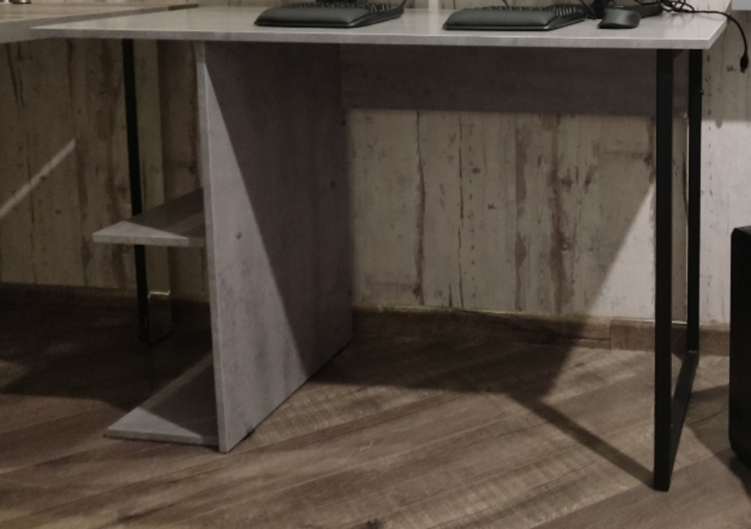 Это просто лучшая покупка, за последнее время. Прослужит я такой стол долго. Если думаете покупать - берите, точно не пожалеете! Выглядит в интерьере очень стильно! Очень рада, что такой товар можно приобрести даже не ехав в магазин, а просто заказать! Сделано качественно! Материал столешницы ЛДСП 16мм, достаточно крепкое (очень радует что не картон обитый двп-шкой как) все отверстия засверлены хорошо, доставка очень оперативная, в процессе транспортировки ничего не было повреждено (даже защитная коробка). Очень нравится порошковое покрытие ножки (подстолье металлическое), тактильно очень приятно. Кромки везде сделаны аккуратно. Цвет ламинации соответствует картинки. Цена и качество стола на высоте! Полочку будем перевешивать чуть выше, чтобы поместился системный блок. Всем советую к приобретению.
