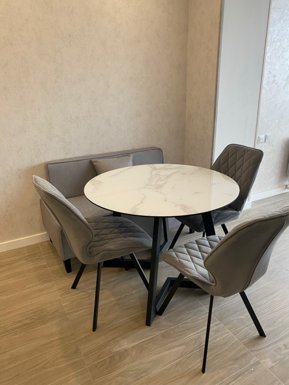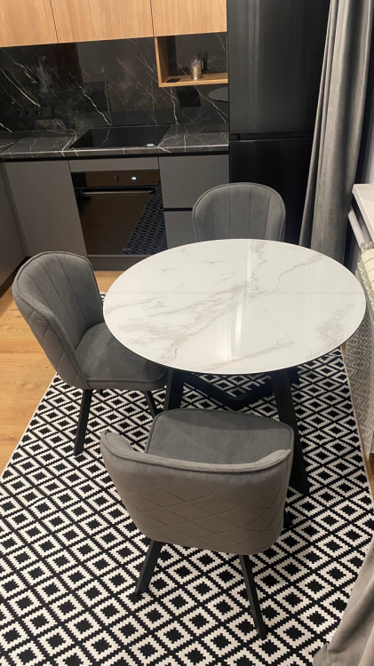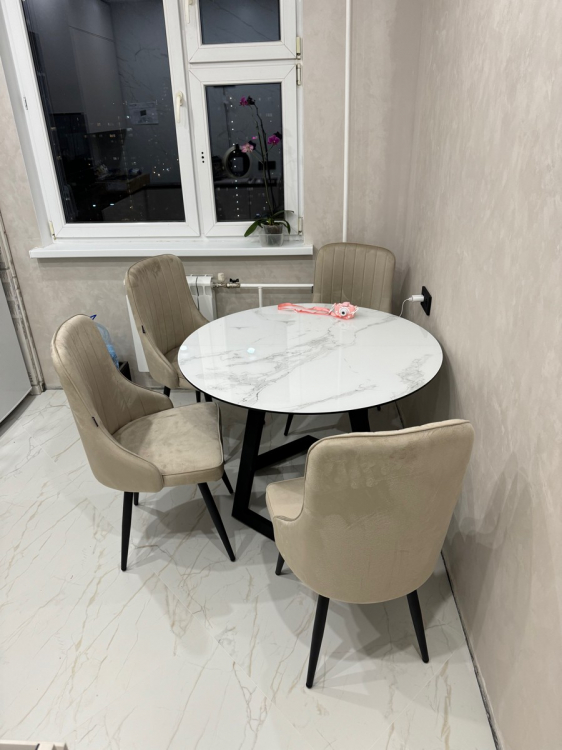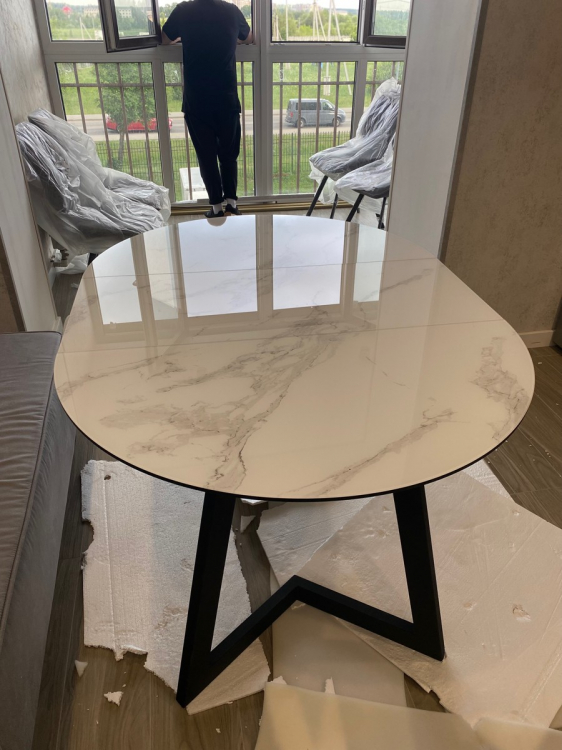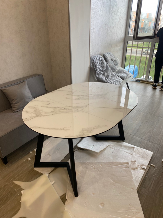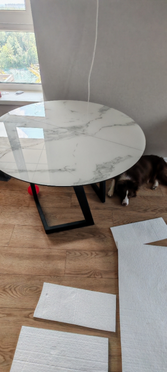 Сначала выбрали другой стол. Выбор в магазине богатый, на мой взгляд, все товары очень практичные и разные в дизайне. Глаза слегка разбежались. Потом понравился этот стол. Но были сомнения, так как не хотелось стеклянную поверхность из-за звуков, когда ставишь на неё, скажем, чашку. Менеджер посоветовал накрыть стол плёнкой. Отличная идея, которая нам в голову не пришла. Стол удобный в использовании, нет углов, чтобы стукаться об них, большая поверхность. При желании его можно сложить до круглого небольшого. Но тогда центральную часть надо хранить отдельно, она не встраивается в конструкцию как у некоторых других моделей. В этом есть и плюс, не съедает пространство под столешницей, можно смело ногу на ногу закидывать, ноги поместятся. Размер стола позволяет вольготно, с большим запасом пространства, размещаться четверым людям одновременно. С плёнкой мы промахнулись потом, купили гладкую, а для глянцевой поверхности, как выяснилось, нужна рефленая плёнка, тогда пузыри под ней не будут образовываться. Как купим нужную, обрежем её по форме стола. Рекомендую и стол и магазин!