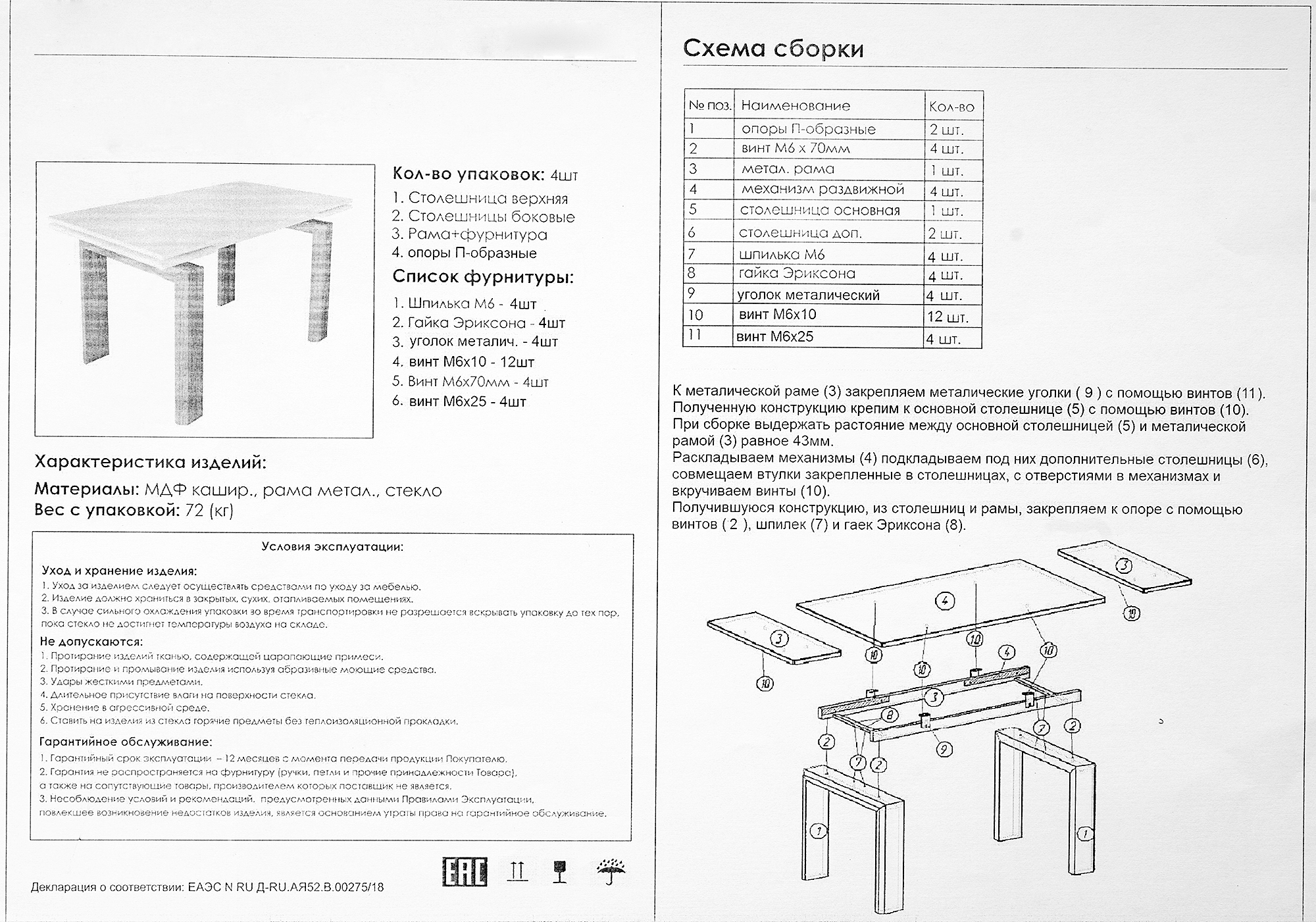 Купил данный стол и 4 стула. Доставили быстро-11.11.2022 заказали и 13.11.2022 в 14:00 уже доставили!!! Упаковка на высшем уровне, под стол даже каркас из ДСП под упаковку был сделан, пенопластом всë уплотнено. Столешница идëт в сборе, только ножки прикрутить и всё.) В общем упаковка надëжней некуда!!! Стол афигенный красивый, устойчивый, надëжный! Покупкой очень доволен, спасибо большое!) К покупке РЕКОМЕНДУЮ!!! На втором фото представлина упаковка) :