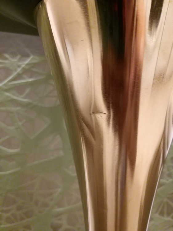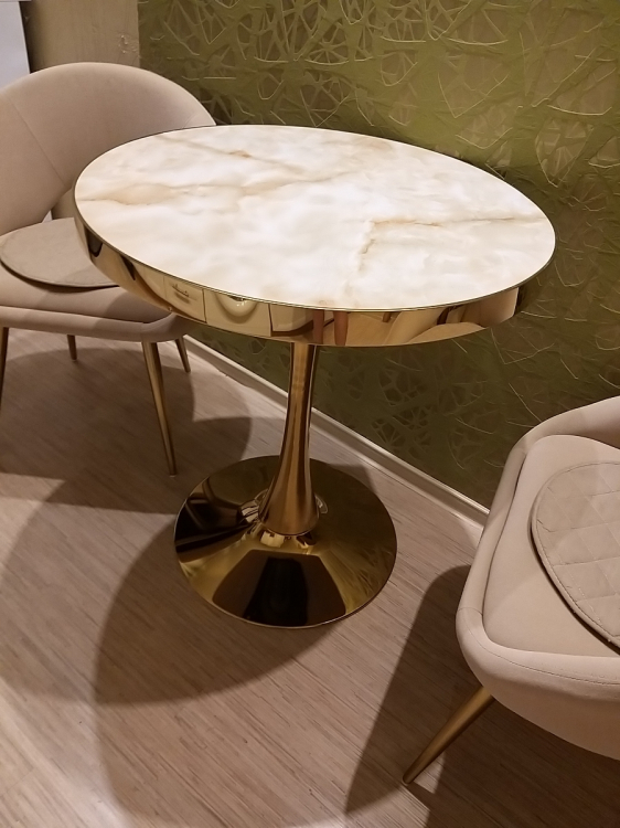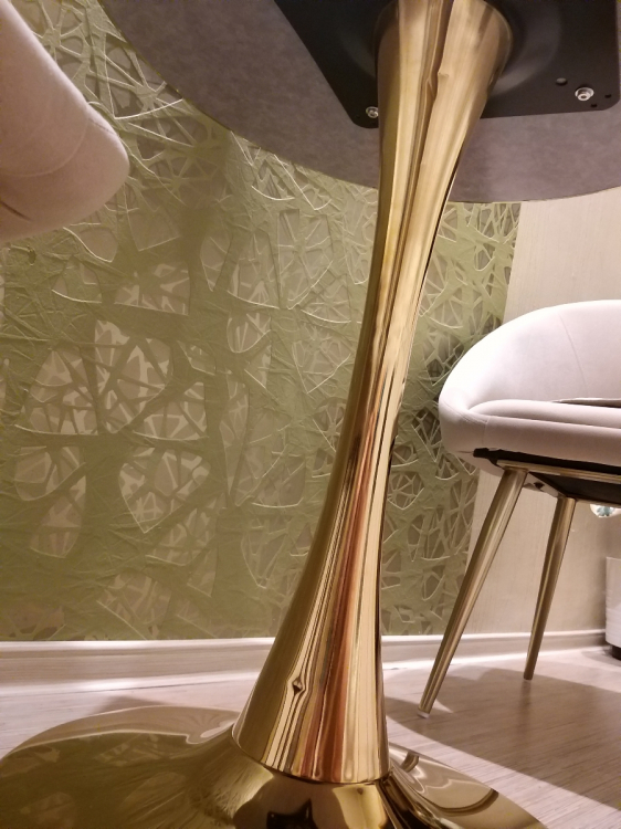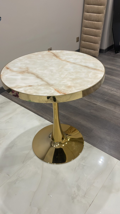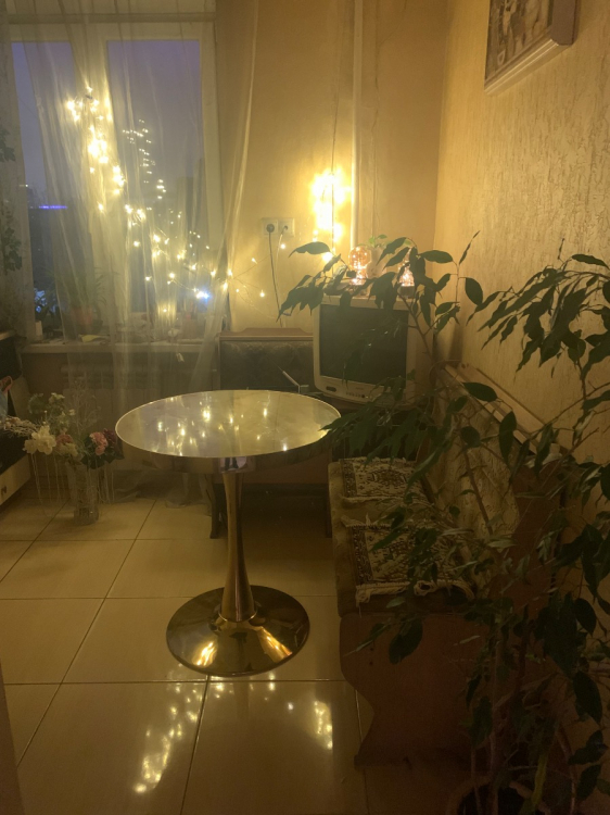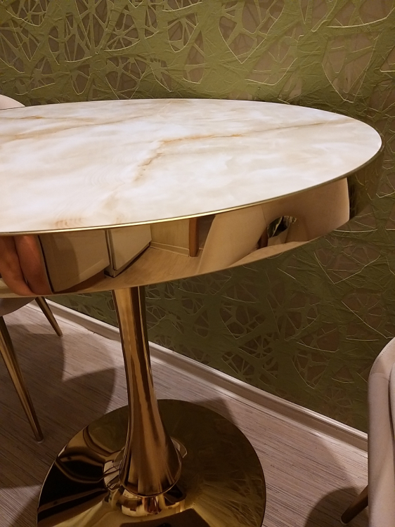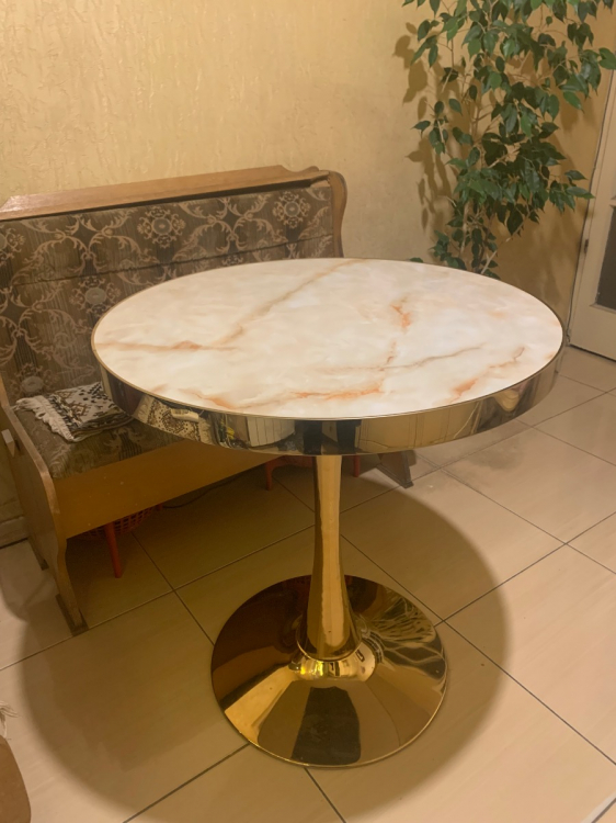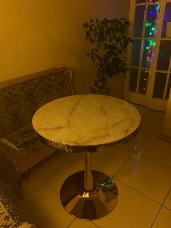 Ну очень красивый! Очень эффектный и красивый столик. Столешница глянцевая, ножка и ребро столешницы из полированного металла. Кажется, что столешница выполнена из натурального камня, т.е. стол выглядит дороже чем есть на самом деле. Расстроило то, что ножка приехала к нам помятой. Скорее всего повреждение было во время транспортировки, поскольку коробка с деталями ножки приехала к нам помятой. Думаю, что такого бы не произошло если бы поставщик приклеил на коробку символ с разбитыми бокалом "хоупкое". Столик все-таки не из дешёвых, поэтому было очень обидно!