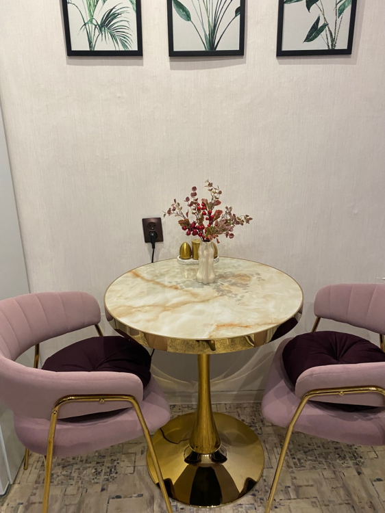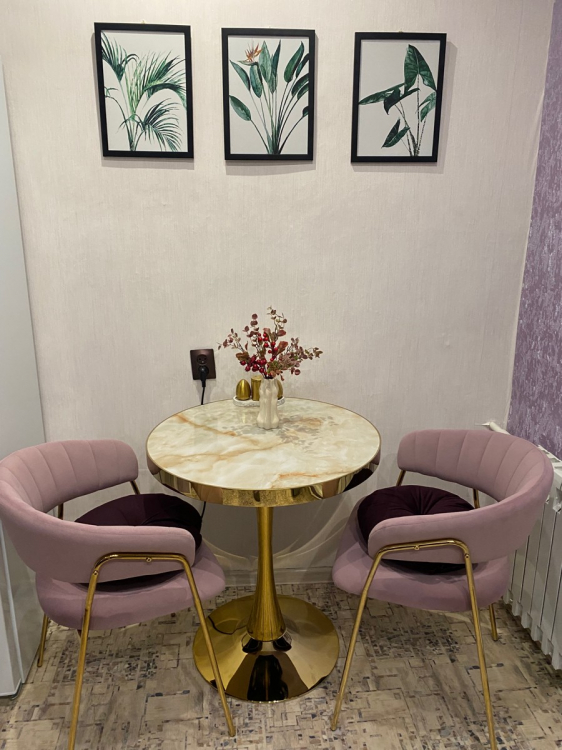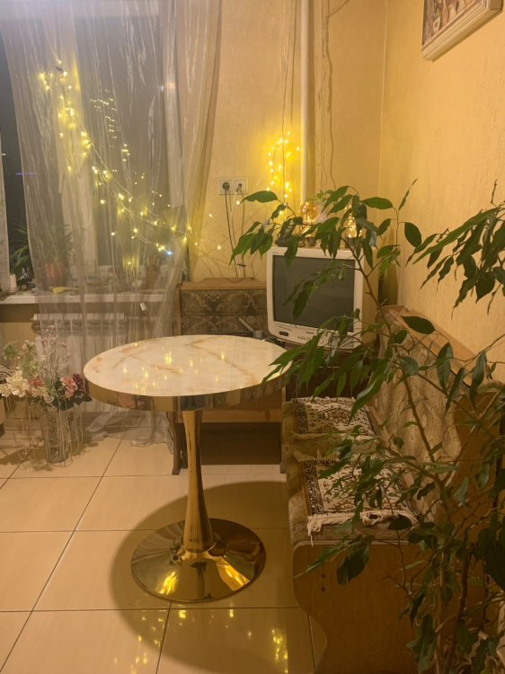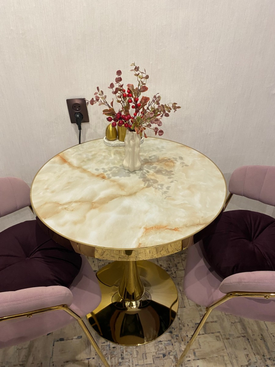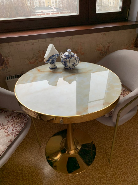 В столик влюбилась, как только увидела его на фото в карточке товара. Ожидания целиком оправдались: выглядит очень симпатично, хочется на него всё время любоваться. Массивная столешница производит солидный эффект, золотой кант уместен - действительно, всё вместе смотрится достойно!.. Сборка: женщина в одиночку справится либо вообще без труда, либо с незначительными умственными затратами; физическая сила не требуется, ключ-винты-гайки - всё в наборе… Доставка: приходят 2 коробки, обе вполне подъёмные. В одной потяжелее столешница, в другой - золотистые подножие со стойкой, металлическая пластина соединительная под столешницу, винты-гайки-ключ и графическая инструкция (такая же, как в карточке товара). Всё качественно упаковано в пупырчатую плёнку и в мягкий плотный полиэтилен… Напоследок: для 1-2х этот столик идеален, для 3х норм, вчетвером, возможно, тесновато. Идеально бы рядом с ним иметь ещё сервировочную тележечку или что-то в этом роде, если рассчитывать на застолье со сменой блюд)) Первые несколько дней использования - 6 звёзд из 5ти возможных…