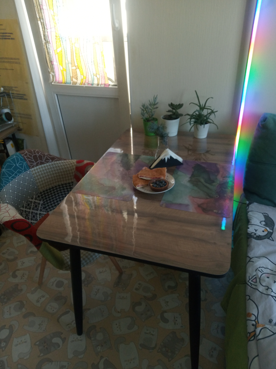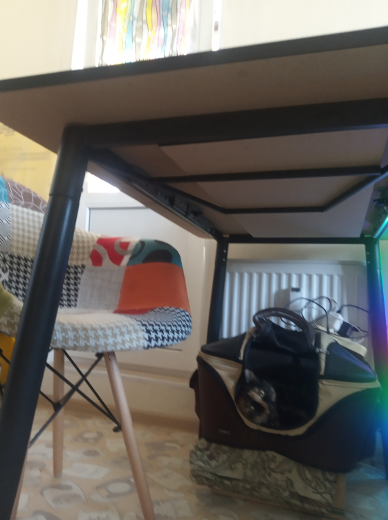 купила стол для квартиры студии. все столы, которые мне нравились, в других магазинах обычно стоили 40-60 к. для меня на данный момент это бессмысленные траты. но я нашла этот стол. он и красив и стоит не дорогое и размер не большой но и не крошечный. если я поставлю на него чайник и две тарелки с чашками то будет ещё место и для остального. на фото стол глянцевый потому, что на нём гибкое стекло. без него стол нормальный. в сборке стол очень прост. часть которая вставляется в середину - просто лежит под столешницей на перекладине. привинчивать ее никуда не надо.