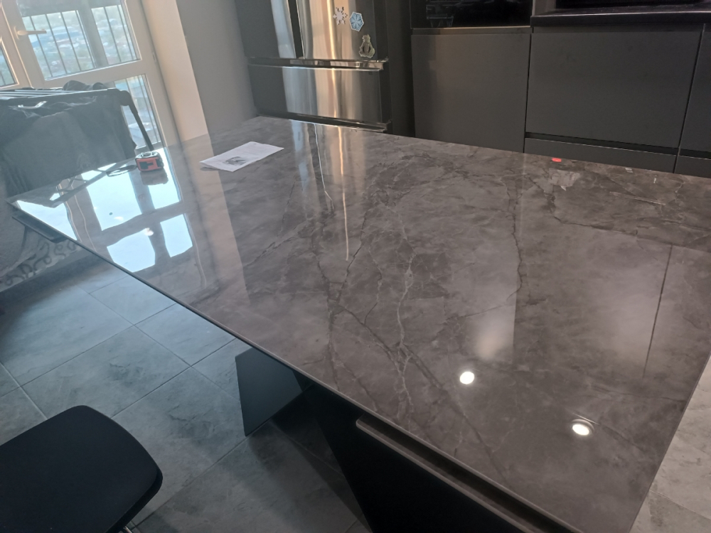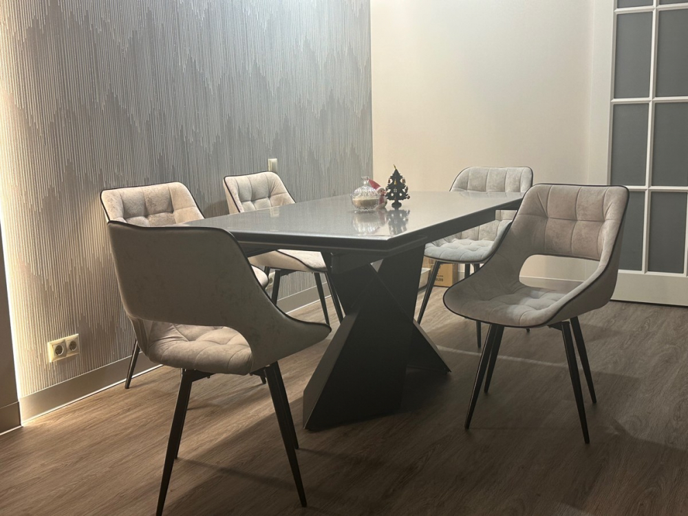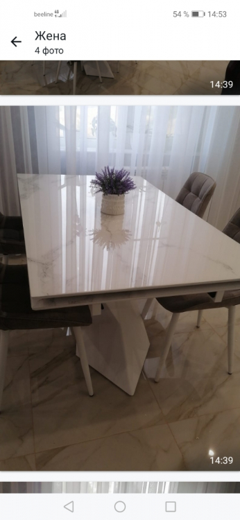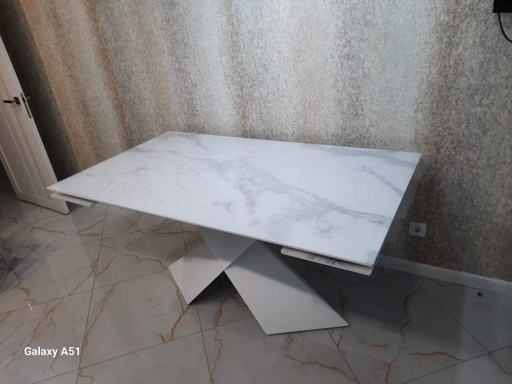 Берите, вы не пожалеете! Замечательный стол для большой семьи, компании, или если у вас есть пространство, которое стол может украсить Тяжелый, с массивным основанием, устойчивый и крепкий. Опора сварная, конечно, не ювелирно, но в глаза не бросается. Если квартира пыльная, опора выдаст по полной Столешница красивейшая, без повреждений. Стол очень тяжелый, одному не то что сдвинуть Для сохранения первозданного вида столешницы, на нее положили матовую гибкую скатерть. Ничего не скользит, не гремит и в глаза от глянца керамогранита не отсвечивает Увеличивая площадь стола, вы видите всю ту же красивую столешницу, вставки выполнены из абсолютно такого же керамогранита как и сам стол, а не обычные белые или невзрачные вставки множества других столов. Очень советую приобретать к столу поворотные стулья Мои ожидания стол полностью оправдал, я искала такой стол, который станет изюминкой для зоны кухни-гостиной и местом приятных повседневных посиделок и дружеских встреч
