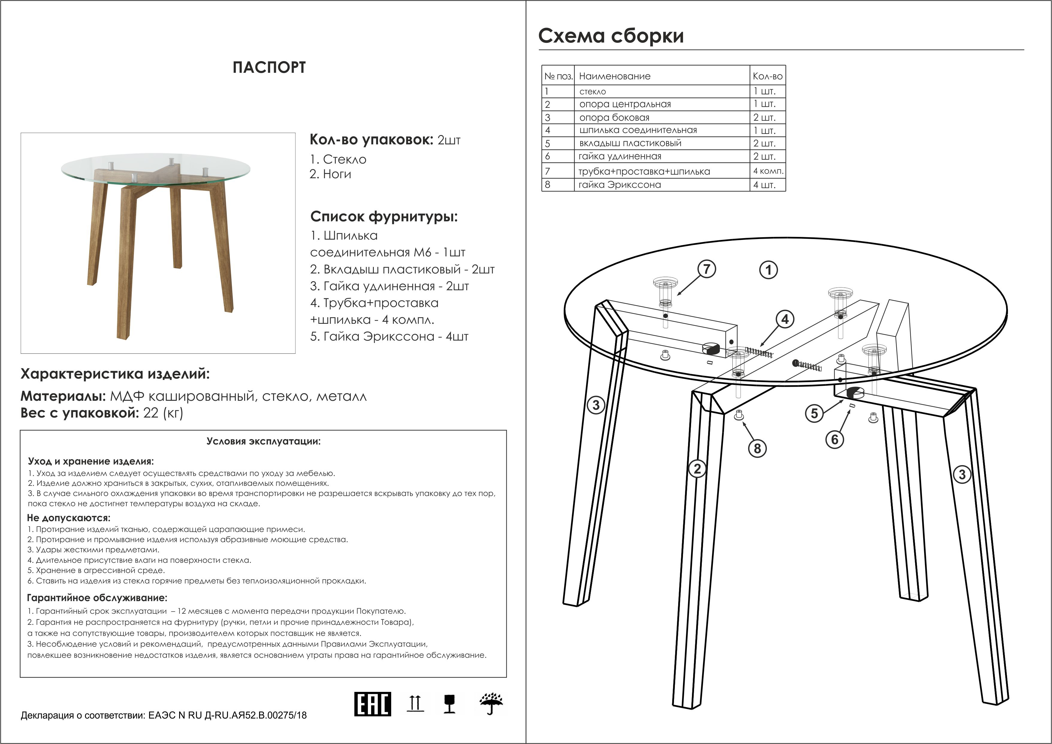 Столешница выполнена из прочного стекла. Кроме превосходных внешних характеристик, способности облегчать и зрительно расширять пространство, стекло устойчивое к попаданию воды, перепадам температур, на поверхности не образуются пятна. Материал не впитывает запахи, прост в уходе, не капризен в эксплуатации. Для удаления следов от пальцев, пыли и незначительных загрязнений достаточно использовать простую влажную салфетку. Также время от времени рекомендуется использовать специализированные составы для полировки стеклянной поверхности.