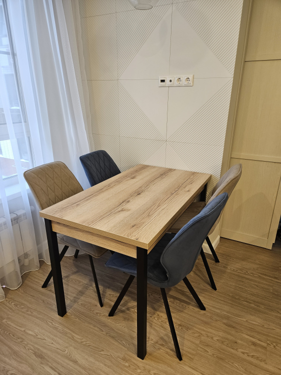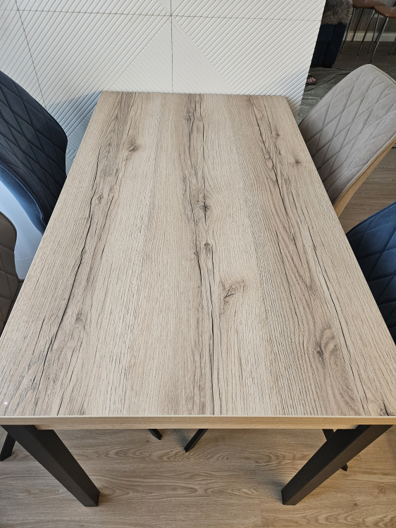 Цвет столешницы дуб делано.Крепкий,надежный, металлические ножки,тяжелый.Цена-качество!Для меня было важно чтобы столешница была без шва по середине и при этом стол раскладывался.Раскладывается он удобно.Очень долго подбирала стол,этот стол лучший для меня,полностью оправдал мои ожидания!Спасибо!