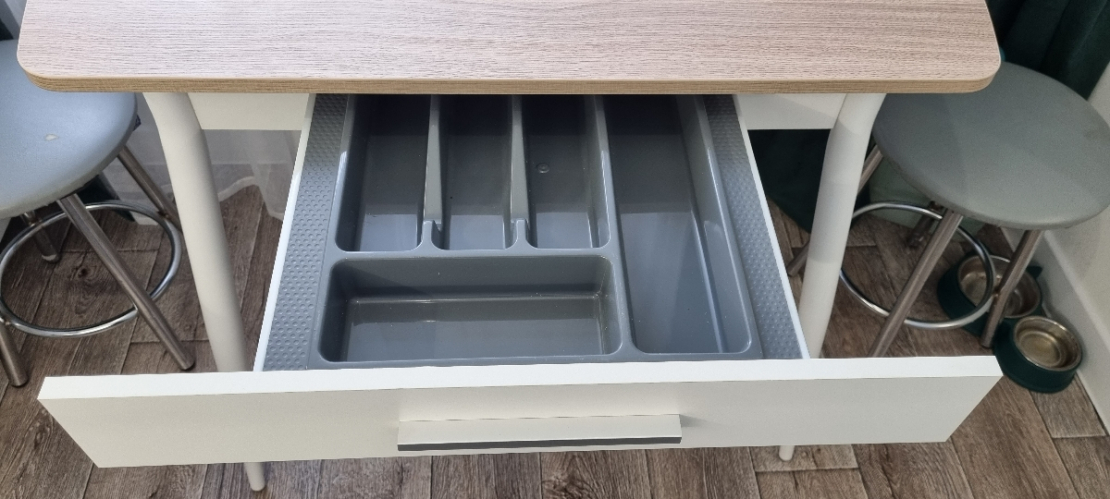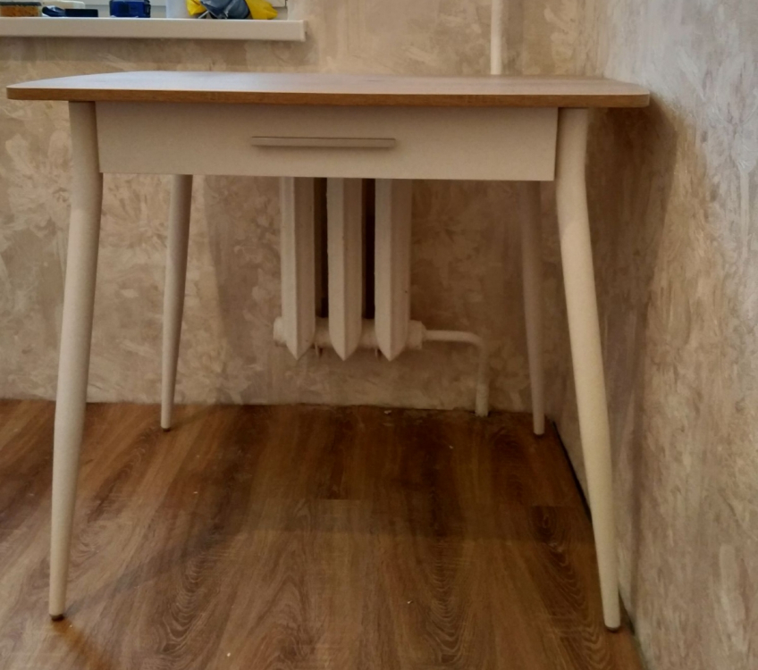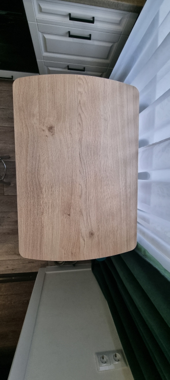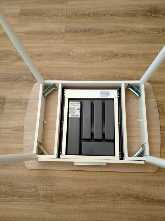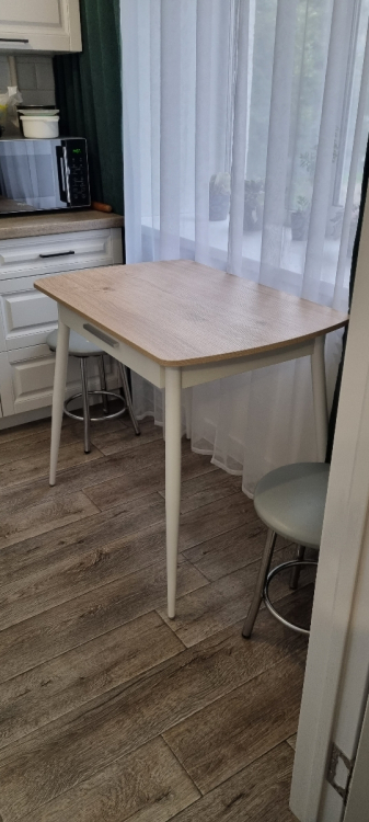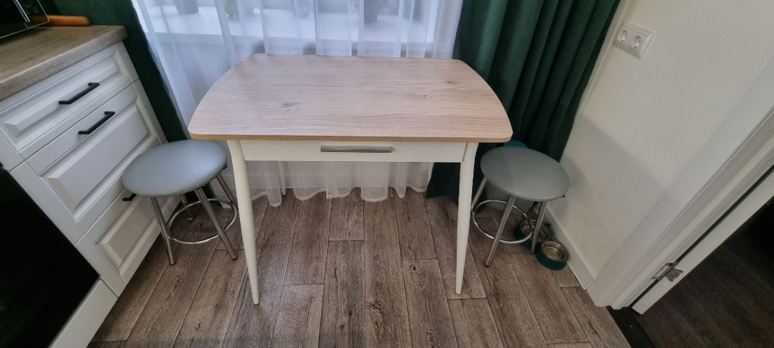 Стол очень понравился. Красивая столешница, имеет рельеф. Ножки металлические. Встроенный ящик под приборы. Собрала за 10 минут, только ножки прикрутила и готово. Небольшие сколы на одной из ножек никак не омрачили радость от покупки, а ножку я прикрутила так, что их не видно. Спасибо! Дополнение: расстояние между ножками сбоку стола: вверху 45 см, внизу 60 см.; Достоинства: Красивый