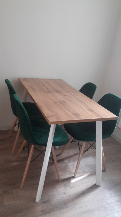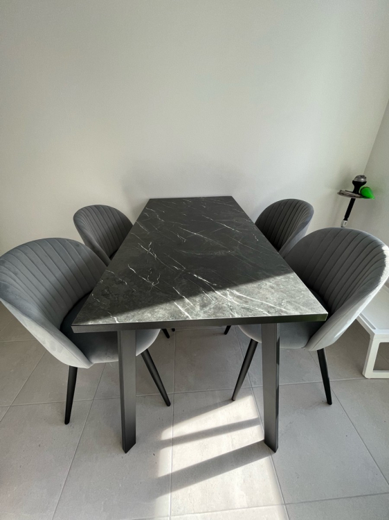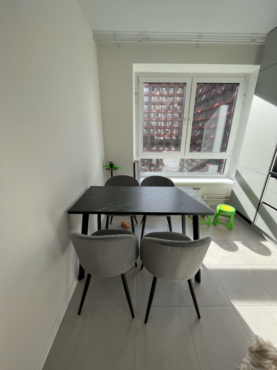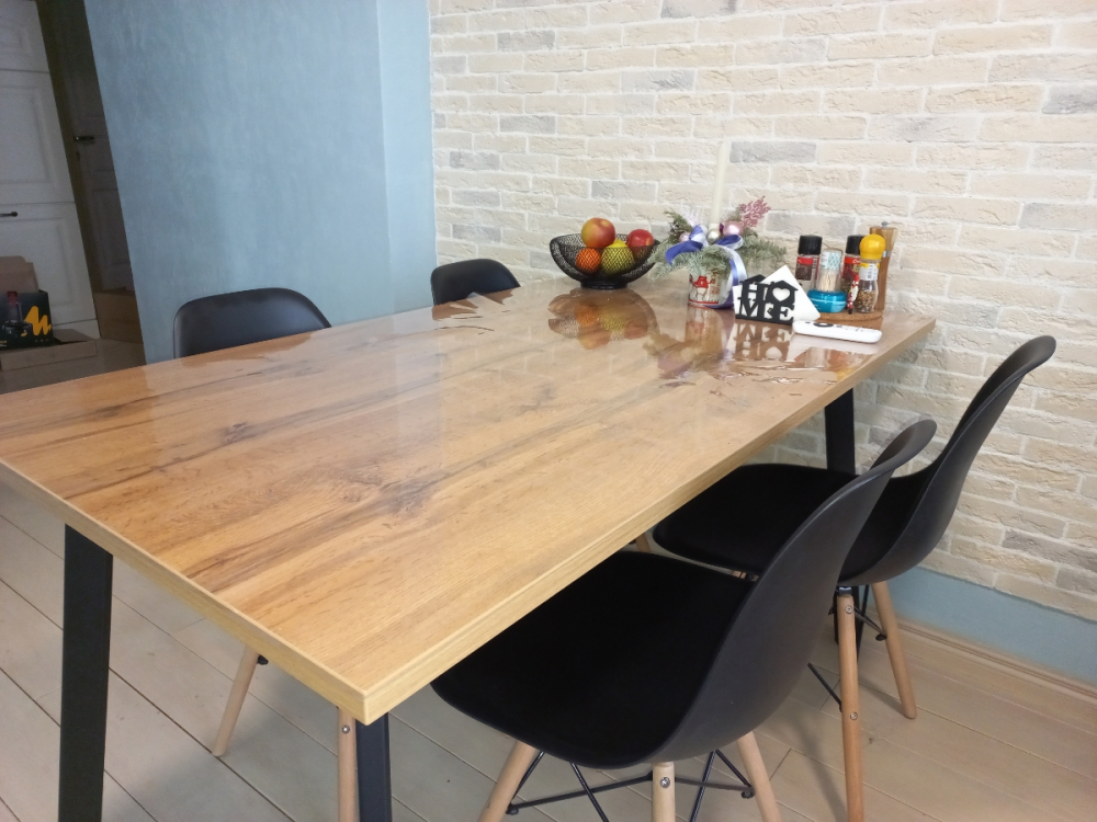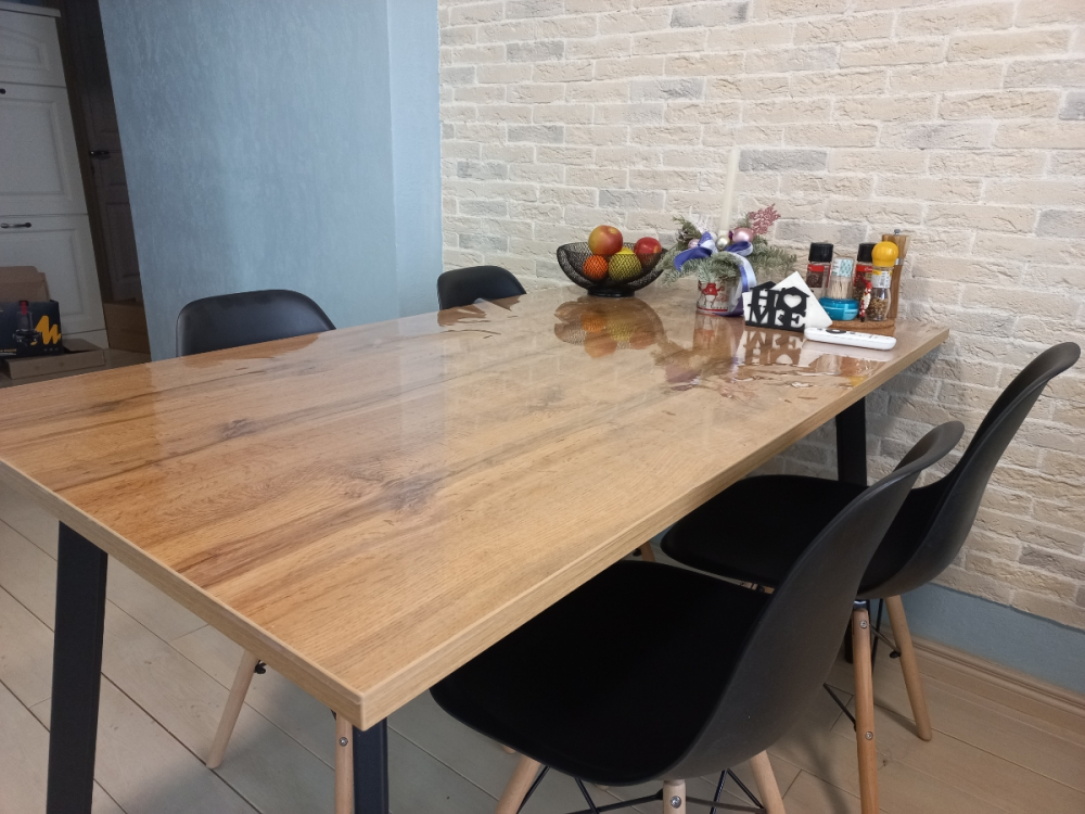 Заказали и получилось как дополнение к кухне , оттенок очень похож.Собрался легко, никаких недочетов нет. Ножки только шершавые,напыление какое-то. Может так задумано конечно. На эластичных колготках затяжка появилась от ножки. Но стол просто супер,мне очень нравится. Единственное стоит учитывать,что ножки устанавливаются по диагонали и от этого стол не прилегает близко к стене,когда кухня маленькая,учитываешь даже такие мелочи.Зато входят два стула Франкфурт вместе под него и очень подходят друг другу в тандеме.; Достоинства: Очень стильно выглядит,тяжелый.; Недостатки: нет