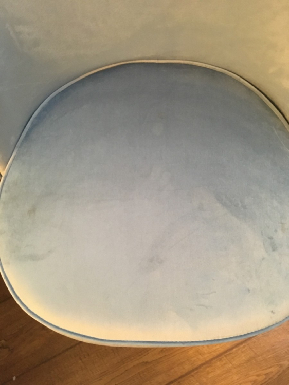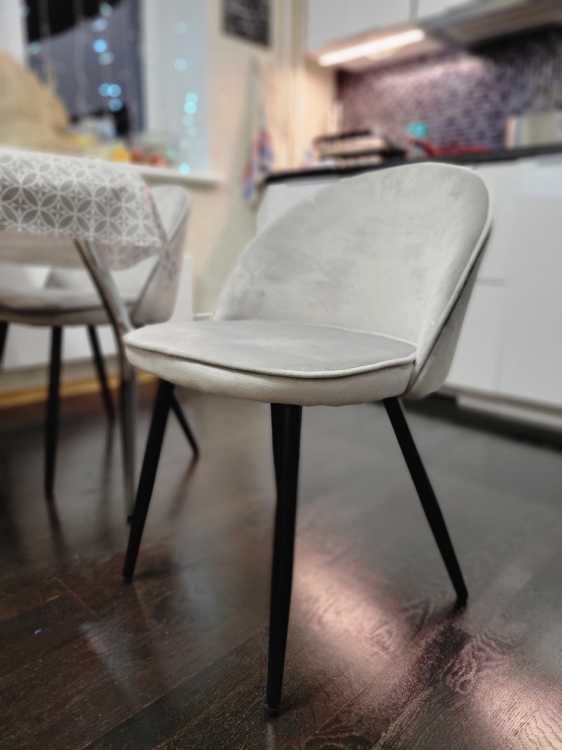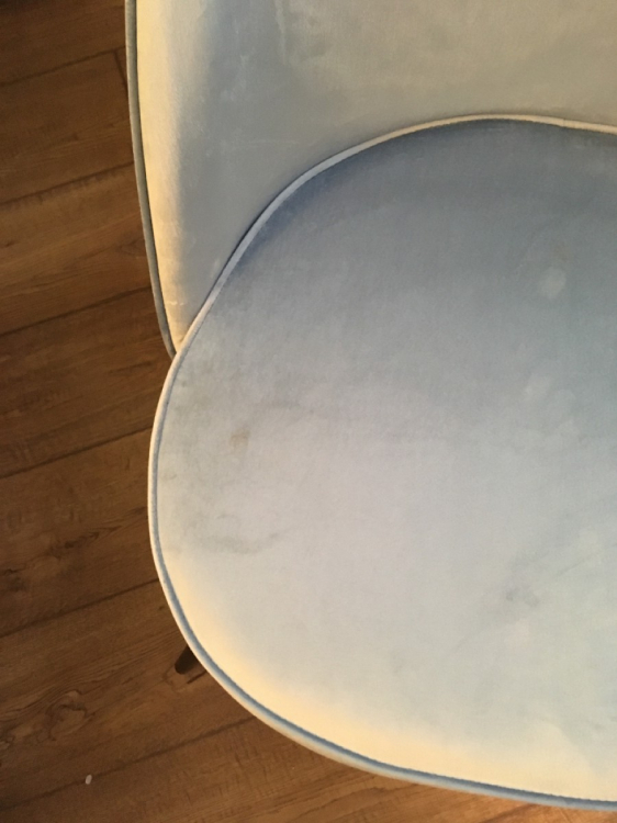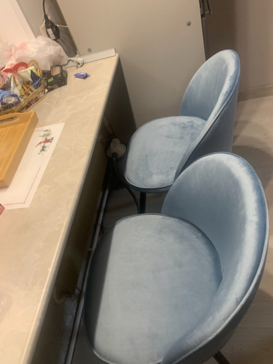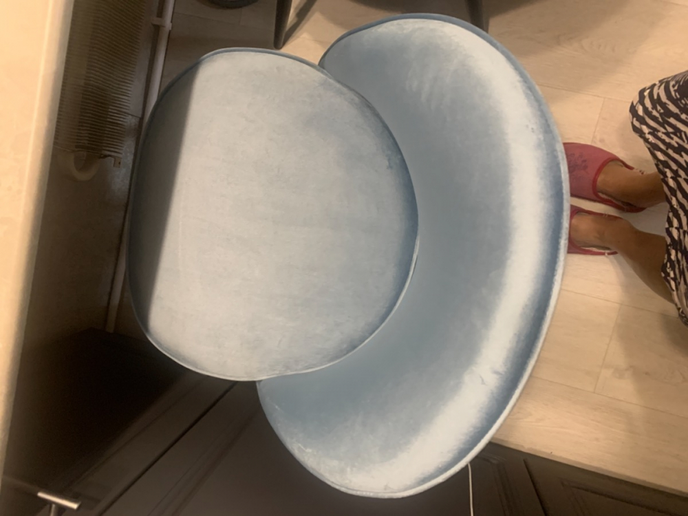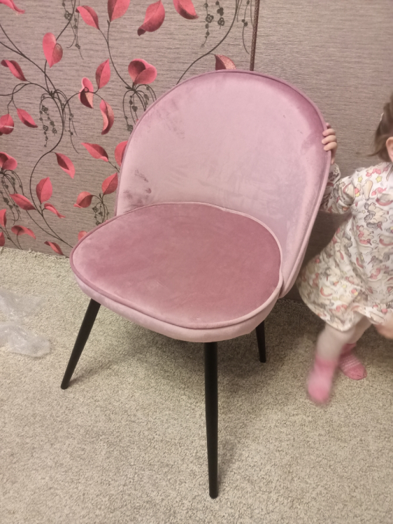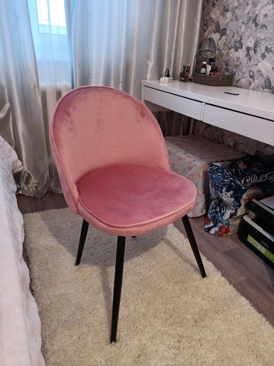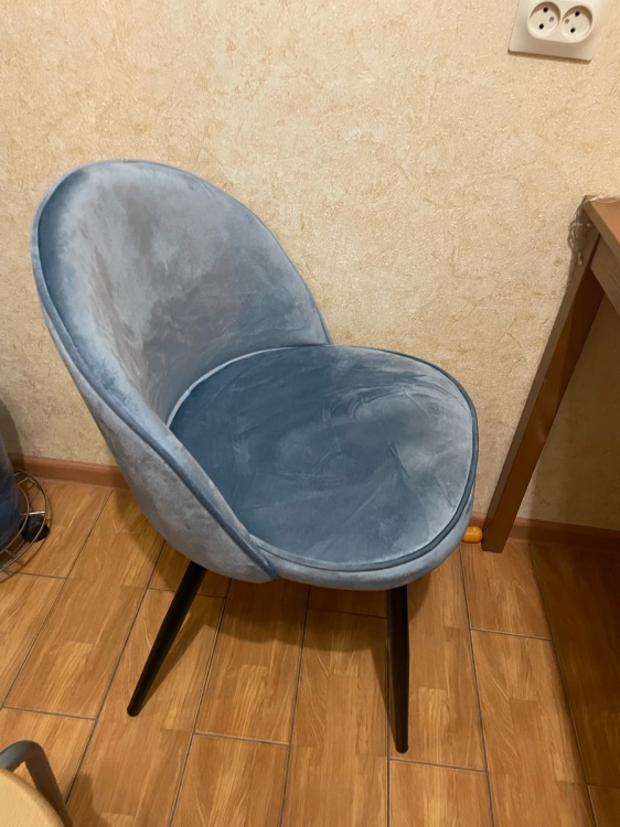 В небольших местах имеются потертости (причём как на 1 стуле, так и на 2 (я заказывала сразу два)). Все шероховатости, лежащий в разные стороны ворс будет виден, а особенно на солнечной стороне, так как ткань блестит, можно сказать, что глянцевый велюр (относительно того, что бывают ещё стулья как матовый велюр. Заказывала в этой же фирме себе в спальню матовый, он мне понравился больше. Но эти два стула для кухни пойдут; Достоинства: В целом неплохой стул; Недостатки: Потертости