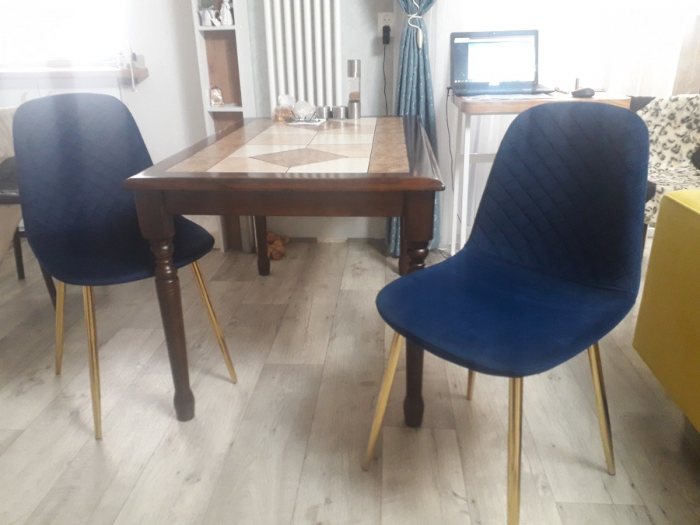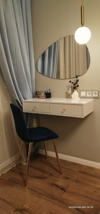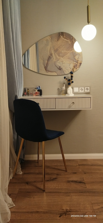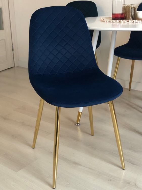 Искала именно синий стул, такого оттенка на золотых металлических ножках. Этот вариант был лучшим и по отзывам, и по цене, и по параметрам. Доставка была осуществлена в срок, муж собрал стул очень быстро, сложностей никаких не возникло: цельный каркас с ножками на 4 болта прикручивается к основанию. Использую стул у дамского уголка уже 2ую неделю - все отлично. По цветовой гамме он вписывается во все помещения нашей квартиры, супер классно смотрится и в кухне, поэтому возможно возьму еще один в пару как раз на кухню. У нас есть кошка, иногда выпускает коготки в мебель, поэтому вся наша мебель в антивандальной ткани. С этим стулом были сомнения в связи с не очень высокой ценой, но на данный момент все отлично, от когтей кошки следов не остается. Спасибо за товар!; Достоинства: Металлокаркас, антивандальная ткань, удобное сидение; Недостатки: Не выявила