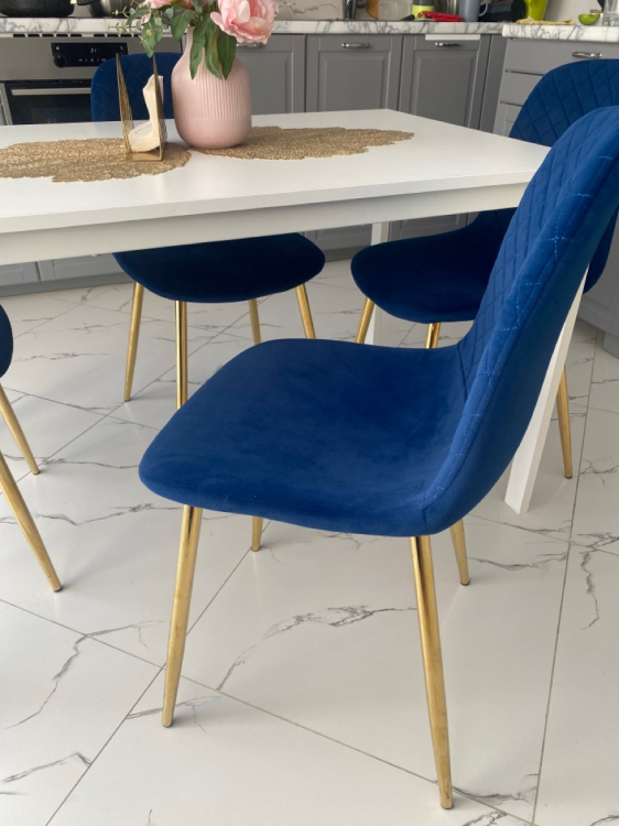 Искала именно синий стул, такого оттенка на золотых металлических ножках. Этот вариант был лучшим и по отзывам, и по цене, и по параметрам. Доставка была осуществлена в срок, муж собрал стул очень быстро, сложностей никаких не возникло: цельный каркас с ножками на 4 болта прикручивается к основанию. Использую стул у дамского уголка уже 2ую неделю - все отлично. По цветовой гамме он вписывается во все помещения нашей квартиры, супер классно смотрится и в кухне, поэтому возможно возьму еще один в пару как раз на кухню. У нас есть кошка, иногда выпускает коготки в мебель, поэтому вся наша мебель в антивандальной ткани. С этим стулом были сомнения в связи с не очень высокой ценой, но на данный момент все отлично, от когтей кошки следов не остается. Спасибо за товар!; Достоинства: Металлокаркас, антивандальная ткань, удобное сидение; Недостатки: Не выявила