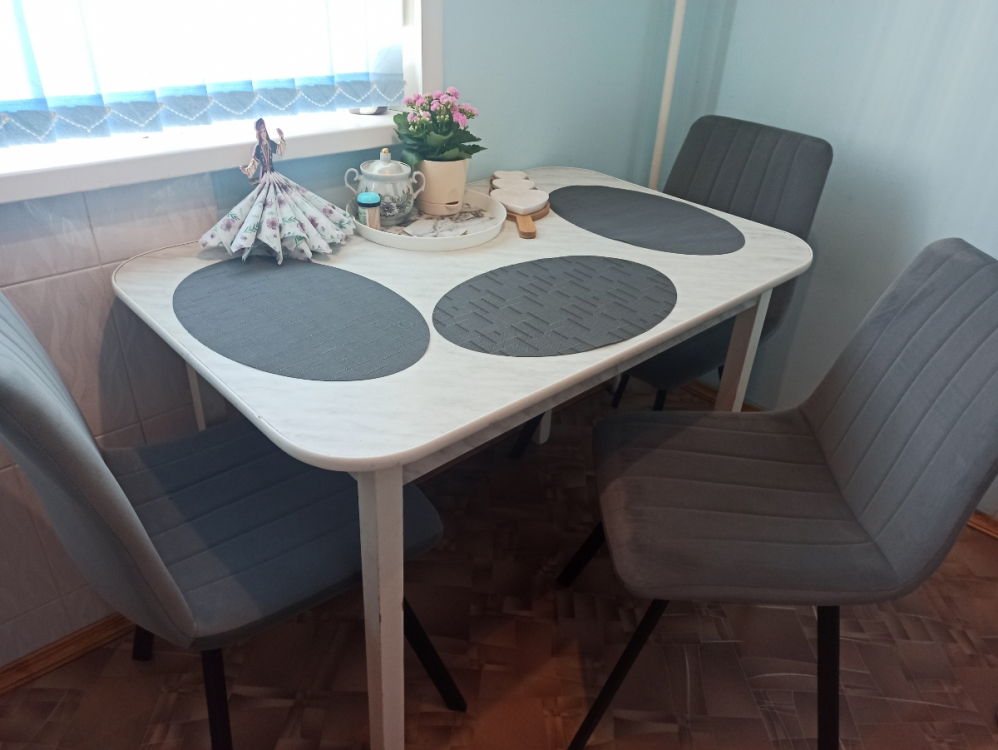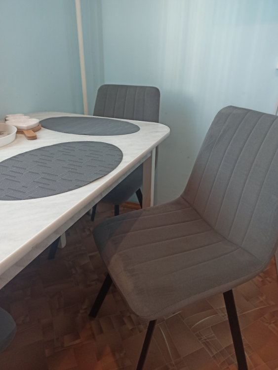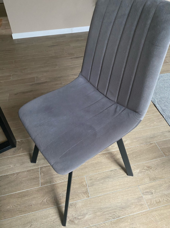 Стулья очень красивые, темно-серый велюр. Собираются очень просто. Устойчивые. Удобные. Покупкой очень довольна. Подбирала под интерьер кухни. Водитель, осуществляющий доставку, очень приятный в общении и доброжелательный. Спасибо.