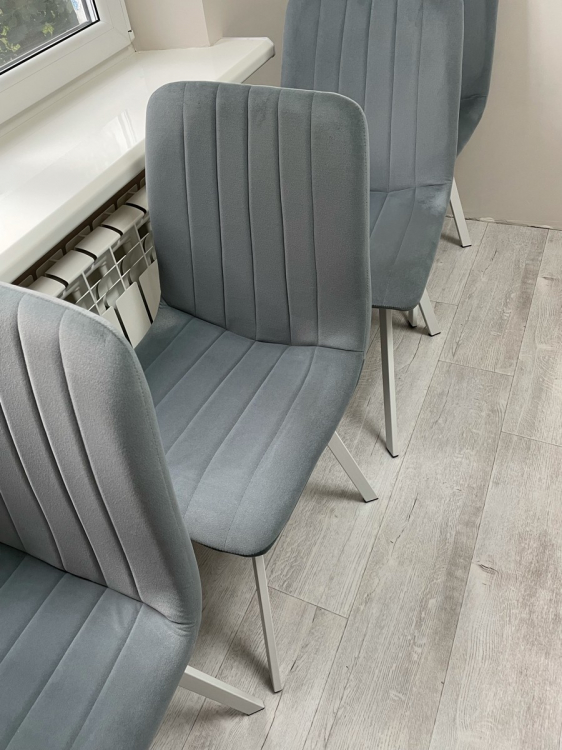 Красивый, удобный Покупали вместе со столом. Очень понравились . Ткань отличная, чистить удобно и быстро. Ножки из металла.