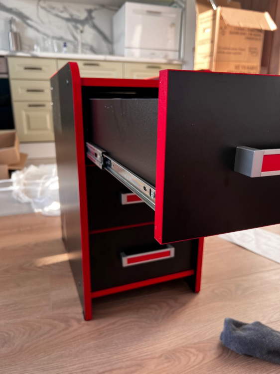 на мой взгляд неплохая тумба за такие деньги; Достоинства: Пришло без трещин,сколов и царапин. Хорошие роликовые направляющие.; Недостатки: Возникли проблемы со сборкой ящиков, на них нет разметки для установки планок. Но получилось собрать. Место установки планрк на фото. Проще говоря по нижней кромке ящика установил планку. Надеюсь, что совет помог.