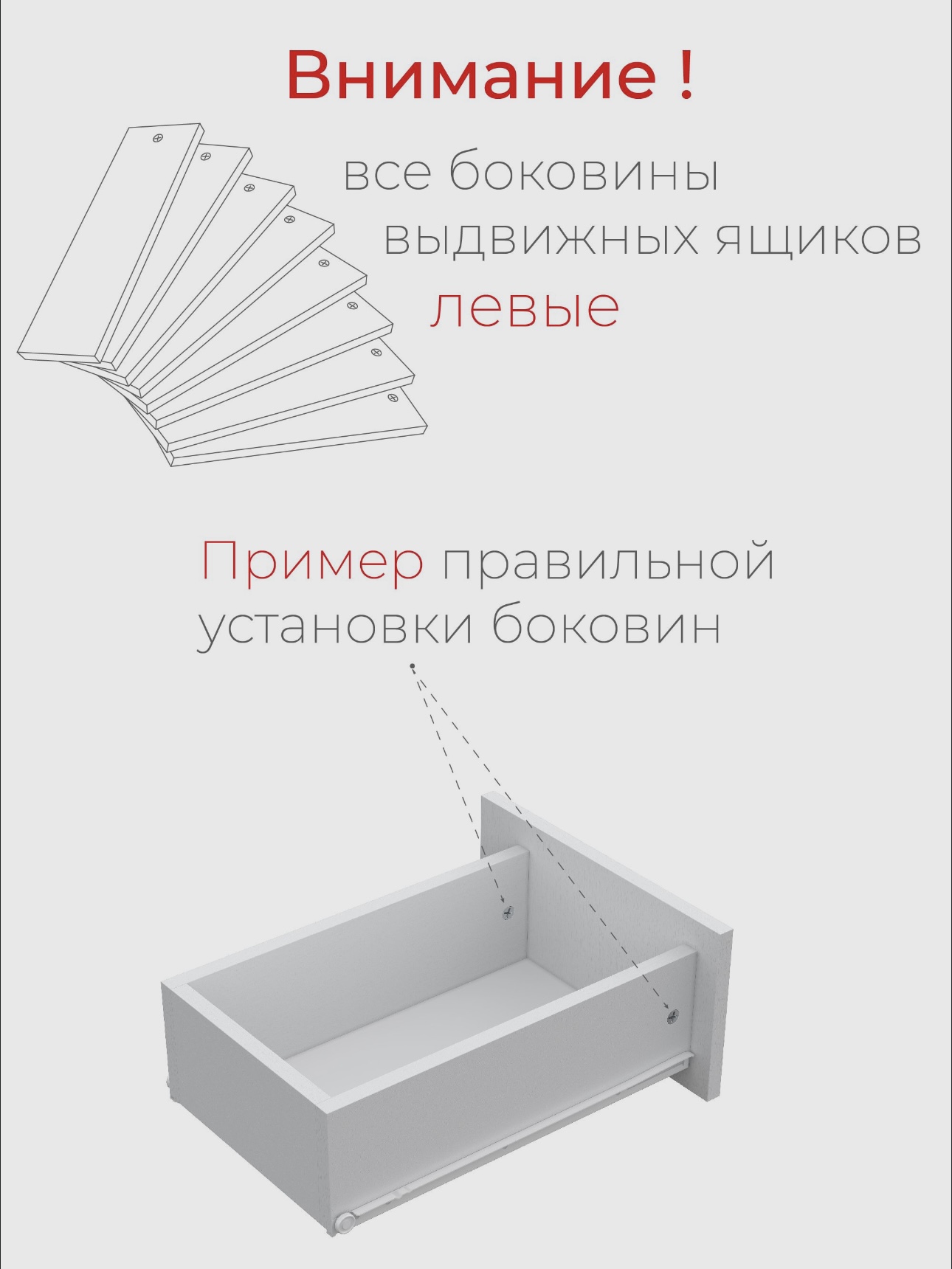 В зависимости от поставки цвет ЛДСП может незначительно отличаться. Изготовитель оставляет за собой право вносить в конструкцию изделия незначительные изменения, которые не влияют на качество продукции или улучшают его. Перед сборкой изделия проверьте количество деталей, их размер и целостность в соответствии с инструкцией. Все боковины выдвижных ящиков левые. Претензии после сборки не принимаются.