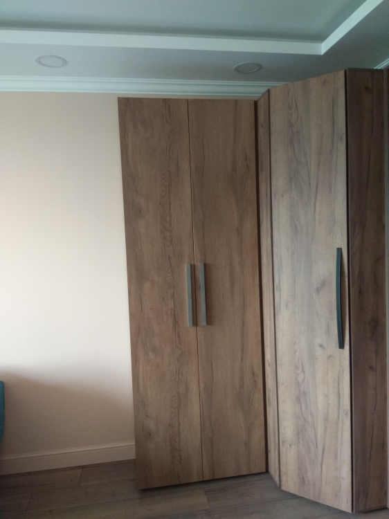 Шкаф угловой – вместительный, при этом внешне компактный шкаф со всеми опциями хранения. В кафу возможно разместить одежду для всех сезонов. Есть и штанга для вешалок, и полки небольшие, полка по верху для размещения нечасто используемых вещей (гирлянды для елки, например). Размер шкафа просто идеальный. Шкаф имеет натуральный цвет «под дерево» и поэтому его можно вписать в любой интерьер комнаты или прихожей.