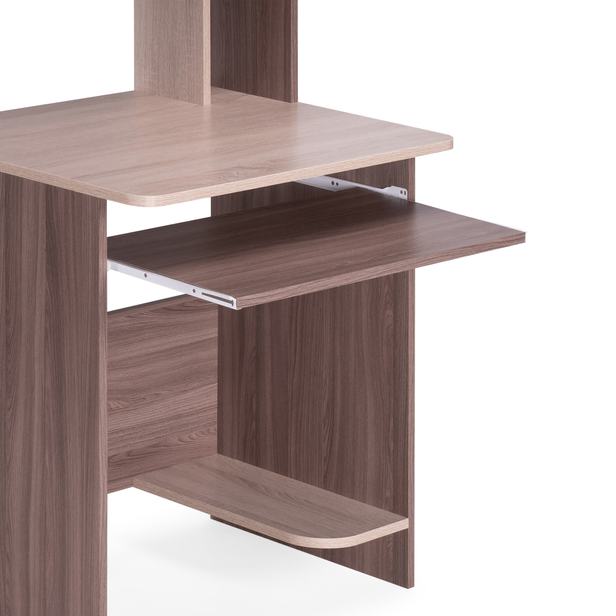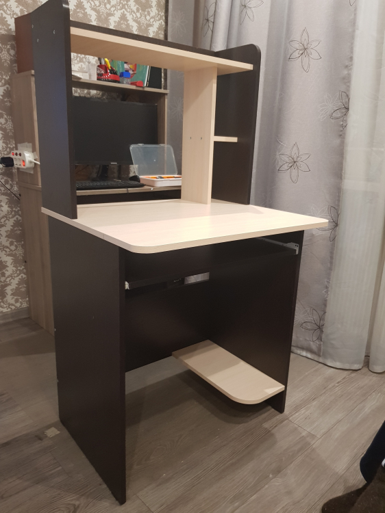 Роликовые направляющие на полке.Пластиковые подпятники.Сборка не универсальная.Стол собирается легко, компактный, удобный за счёт сочетания тёмного и светлого цветов в интерьере смотрится очень интересно.