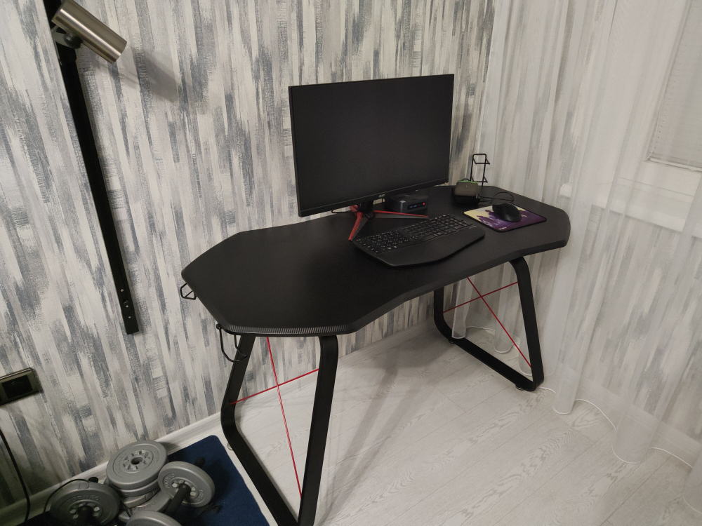 Поверхность столешницы покрыта пленкой под карбон.Стол оснащен подстаканником, крючком для наушников и универсальным держателем.