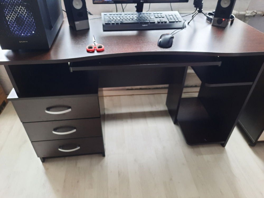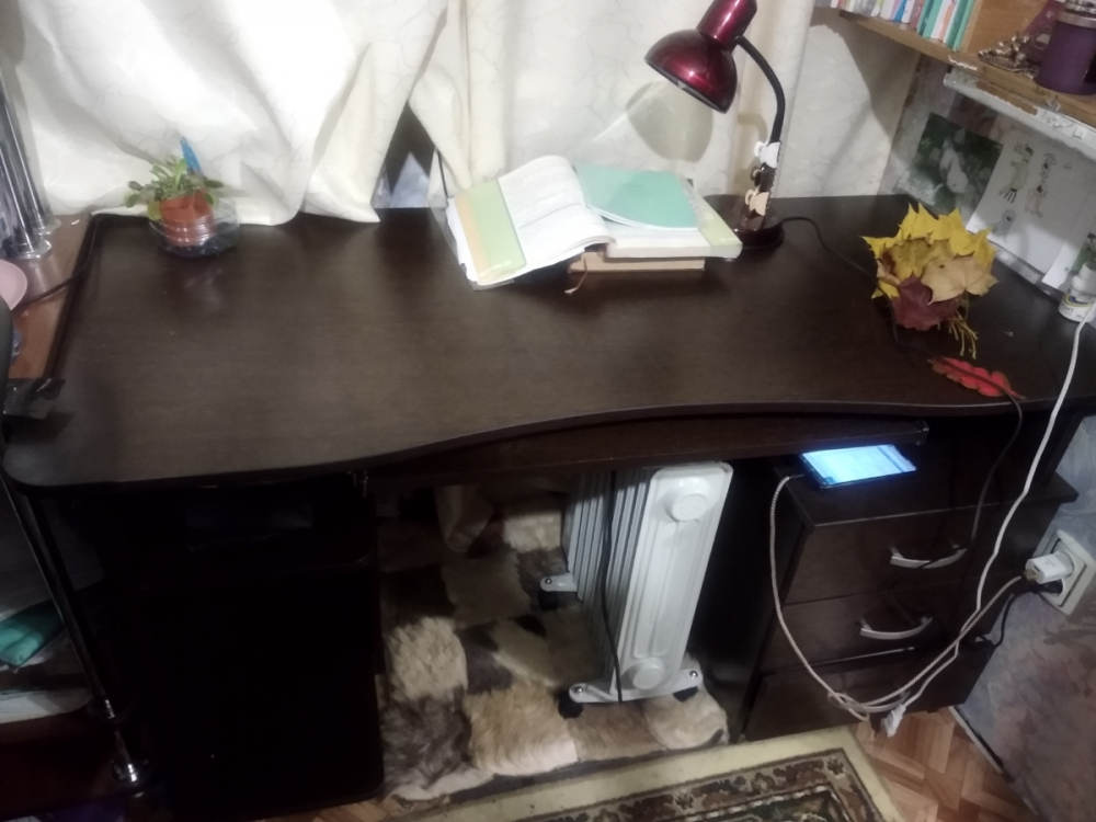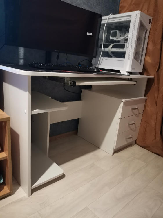 Долго выбирали стол для новой квартиры, потому что я упорно твердила, что нужно столешницу 60см в ширину и выше. Заморачивались с системным блоком, с подвесной полкой для клавиатуры (я её ненавижу, тут она есть, но я ей не пользуюсь, напрочь игнорируя). Так или иначе пришли к этому универсальному столу (вызванные по авито сборщики собрали не той стороной, системником к батарее, будем пересобирать), и он выглядит внушительно, устойчиво и надёжно. Здесь смогут поместиться и два монитора (когда я обзаведусь вторым), и два кота (когда я обзаведусь вторым). Пока что их места занимает системник.; Достоинства: Большой, прочный; Недостатки: Пока не обнаружены
